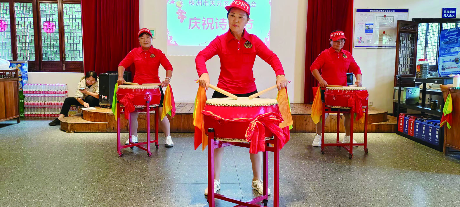 庆祝诗人节吟诵表演现场的威风锣鼓敲响。