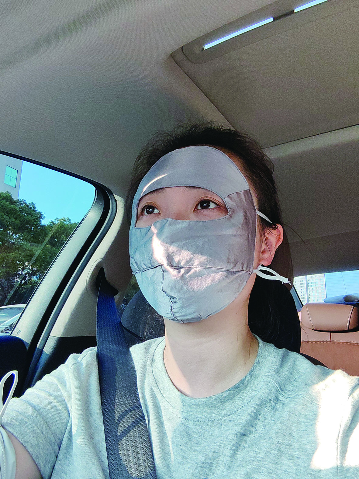 市民吴女士戴着“脸基尼”加入“防晒大军”。 记者/伍靖雯 摄