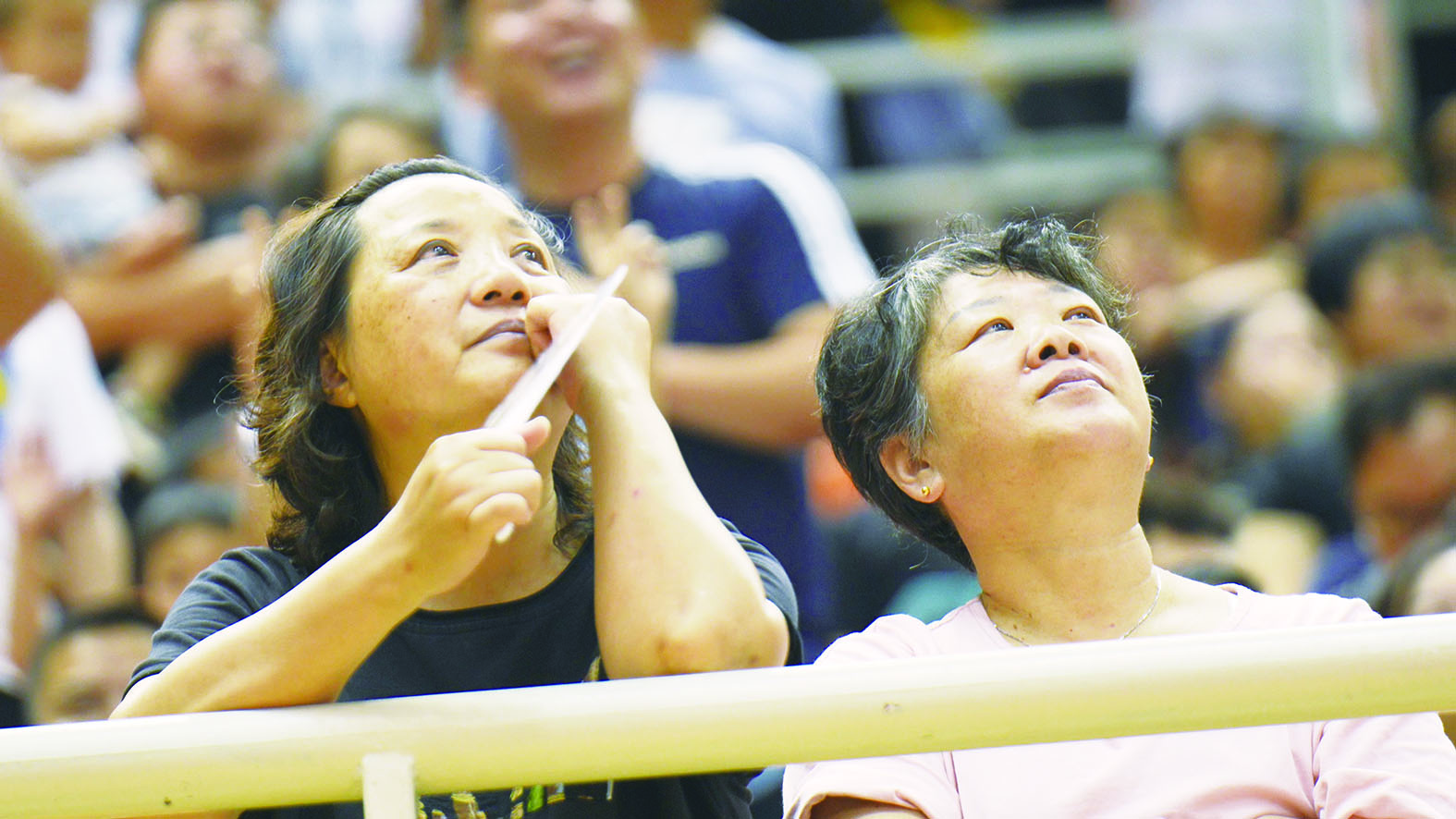 六旬铁杆球迷看了近百场“厂BA”,龙峰(右)和彭淑君(左)在第一排看球 记者/谭昕吾 摄