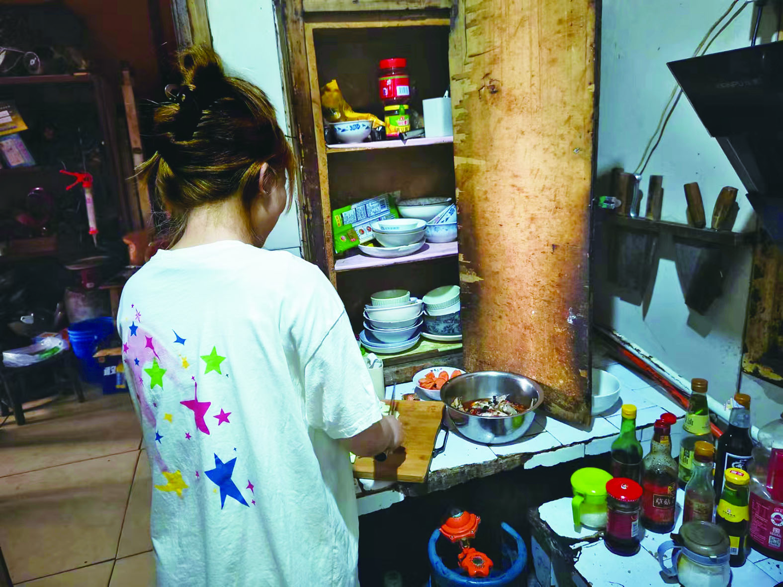7月16日上午,记者来到小春的家。她正在准备饭菜。环顾四周,碗柜的木门已经起了毛边,灶台是用水泥加瓷砖简单砌的,厨具也是老式的煤气罐。