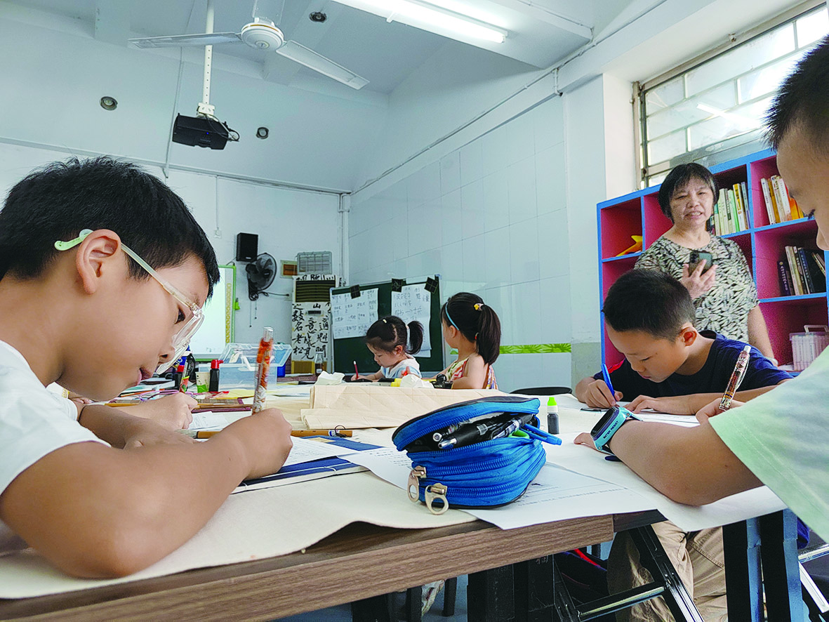 孩子们在稻花香公益发展中心暑期托管营课堂上练习书法。 记者/易楚曈 摄