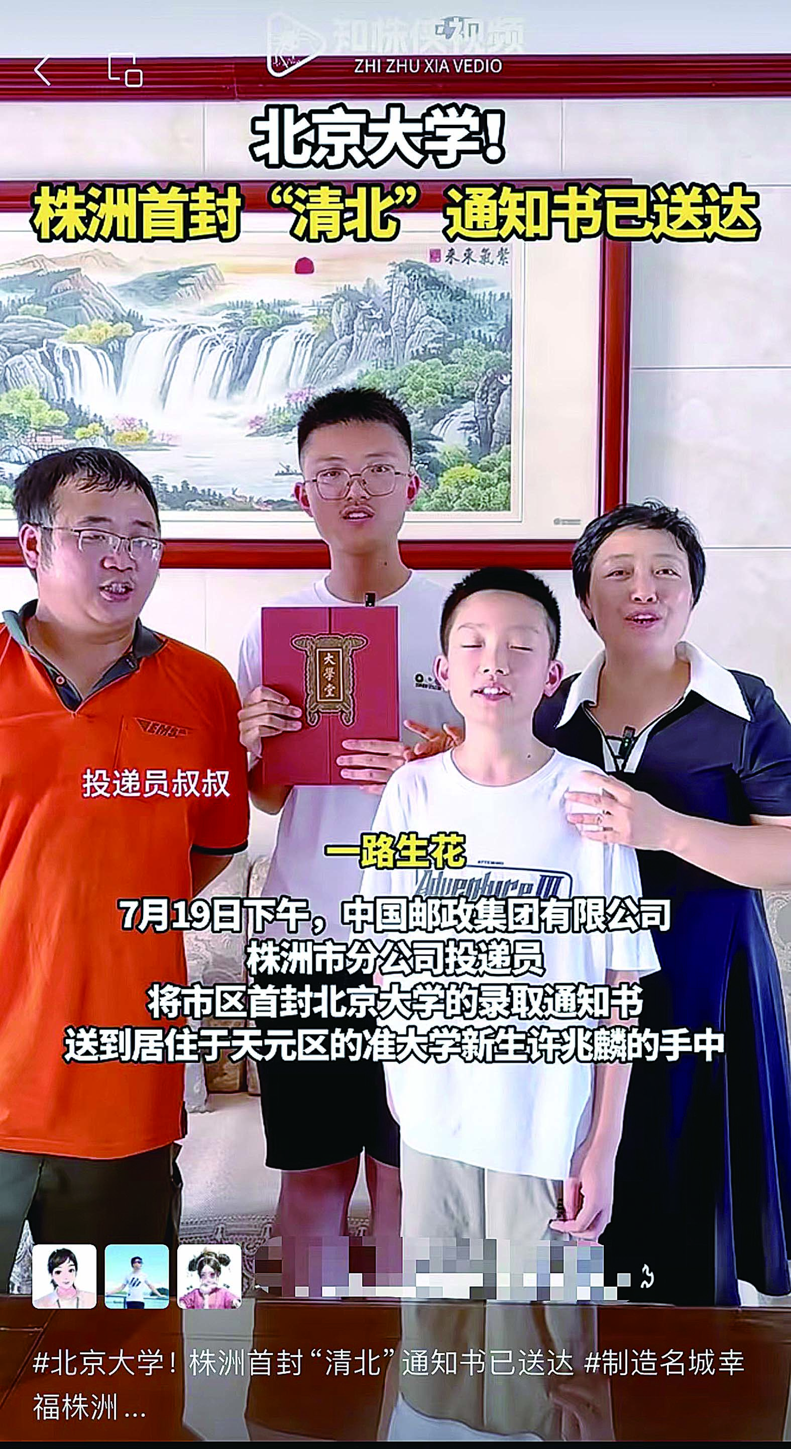 7月19日下午,株洲首封北京大学的录取通知书送达居住于天元区的准大学生许兆麟手中,祝他前程似锦,一路生花。