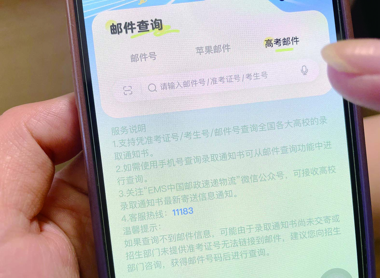 考生可通过“EMS中国邮政速递物流”公众号查询进程。记者/戴凛 摄