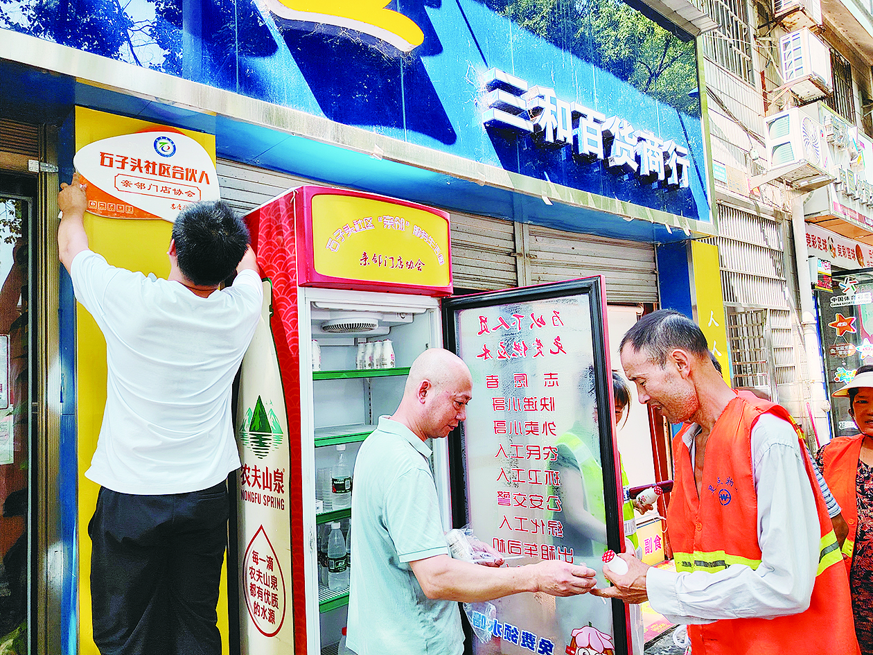 石子头社区辖区商业繁荣,有120多家社区门店。7月25日,石子头社区“社区合伙人”—“亲邻”门店协会启动,12家门店先期加入,为居民提供便民热饭、爱心雨伞、饮水、手机充电、爱心药箱、管道疏通、健康医疗等便民基础类服务。