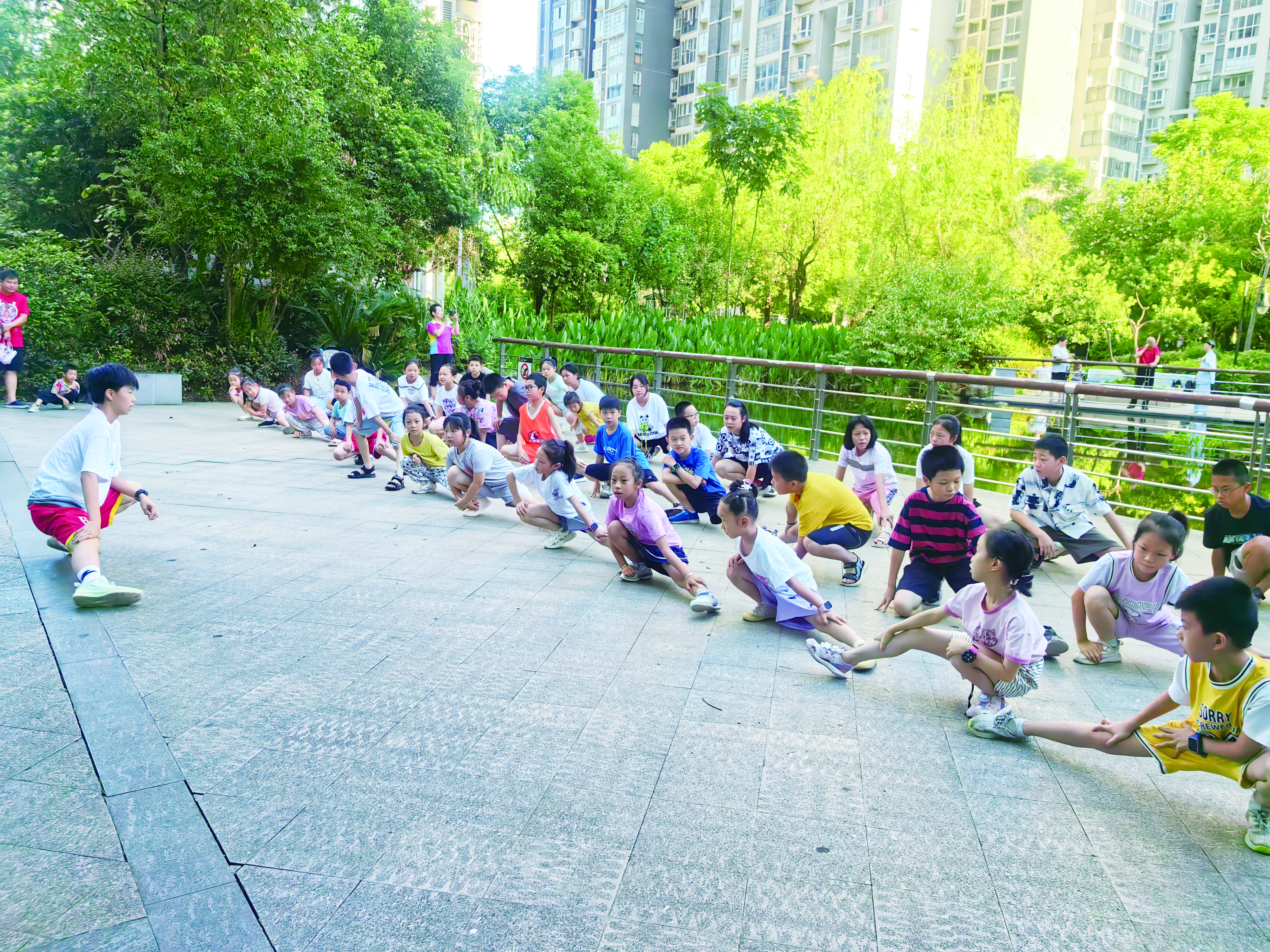 刘俊彪觉得孩子们一起锻炼是件好事,于是在小区业主群里发出了邀约,没想到响应的家长很多。“第一次大规模晨跑是7月15日,当天来了50多个孩子。”刘俊彪介绍说,女儿刘紫琪和她的好朋友吴瑾萱带着小朋友们做热身运动,并领队跑步,他则在一旁做看护工作,“有的小孩只有4、5岁,我怕他们摔着,一路跟着照看他们。”