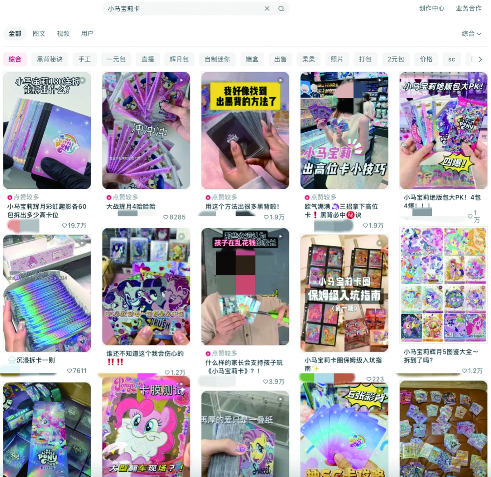 记者在小红书平台上查询“小马宝莉卡”时发现,有关该主题的笔记数量高达70余万篇,而相关商品的上架数量也超过了14万件。此外,一些视频博主通过直播开卡的方式,仅仅通过每晚展示开启十几包卡片的过程,便能轻易吸引数千观众在线观看。