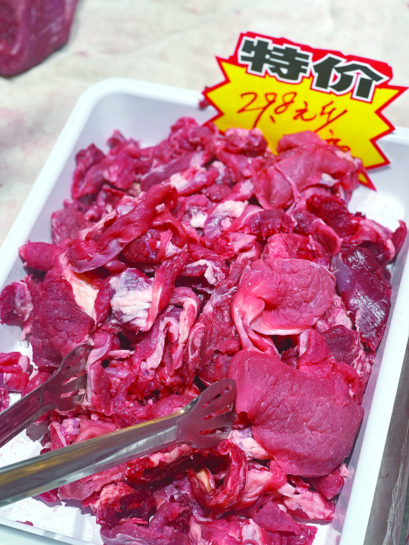 记者注意到,旁边的鲜肉区内,“毛平黄牛腩”打出了促销价,同样是每公斤59.6元。