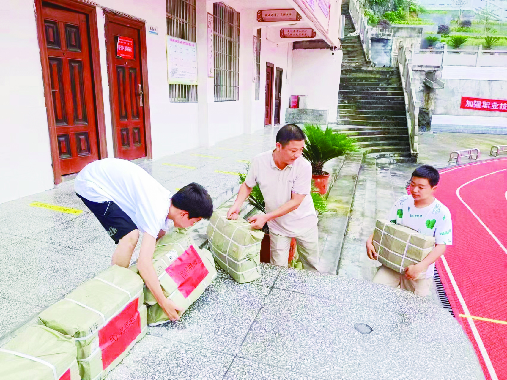 宋鹏华(左二)正在搬运捐赠物资。 受访者供图