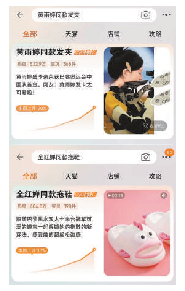 记者在电商平台上检索发现,“黄雨婷同款发夹”相关商品有300余件,一周内相关话题热度上升120%。部分商品显示“全网热销9万+”“24小时内1000+人已买”“已抢3.8万+件”等字样。“冠军同款发夹这几天销量确实明显增加,买的人很多,库存已经没多少了。”一家店铺的客服人员表示。