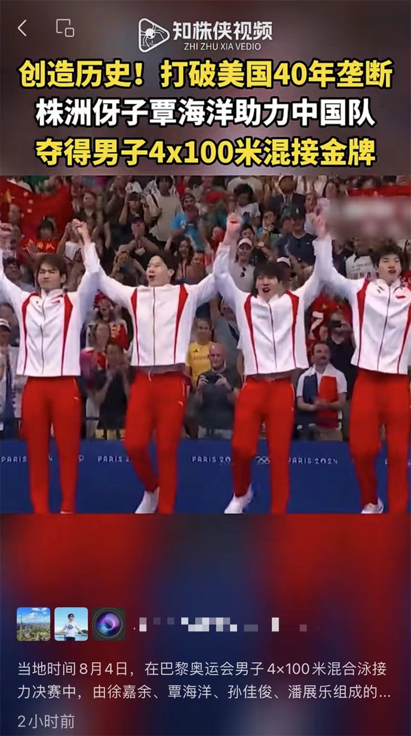 北京时间8月4日,在巴黎奥运会男子4×100米混合泳接力决赛中,株洲伢子覃海洋和队友徐嘉余、孙佳俊、潘展乐组成的中国队夺得金牌,打破了美国队40年的金牌垄断。