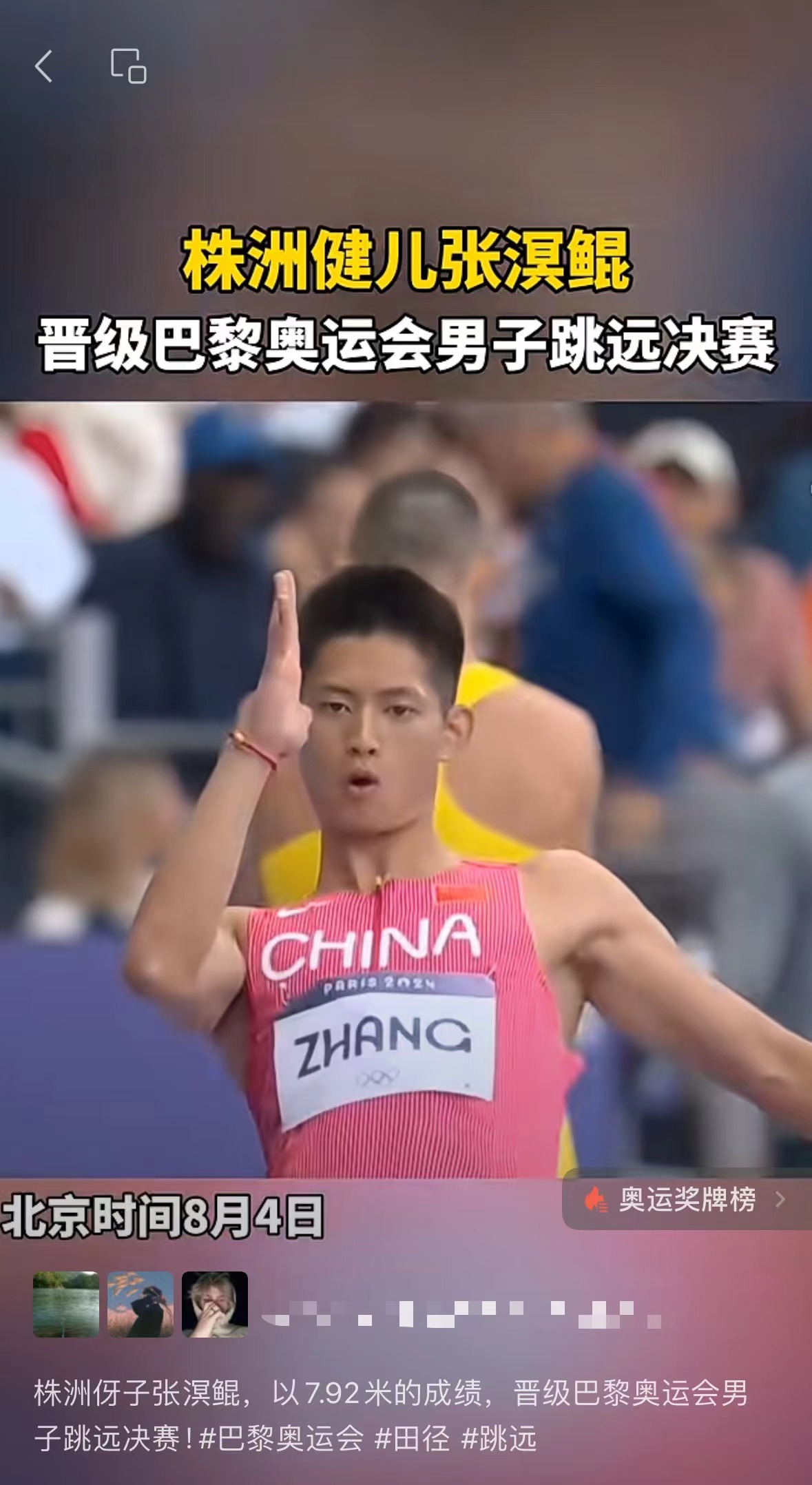 【株洲健儿张溟鲲晋级 巴黎奥运会男子跳远决赛】