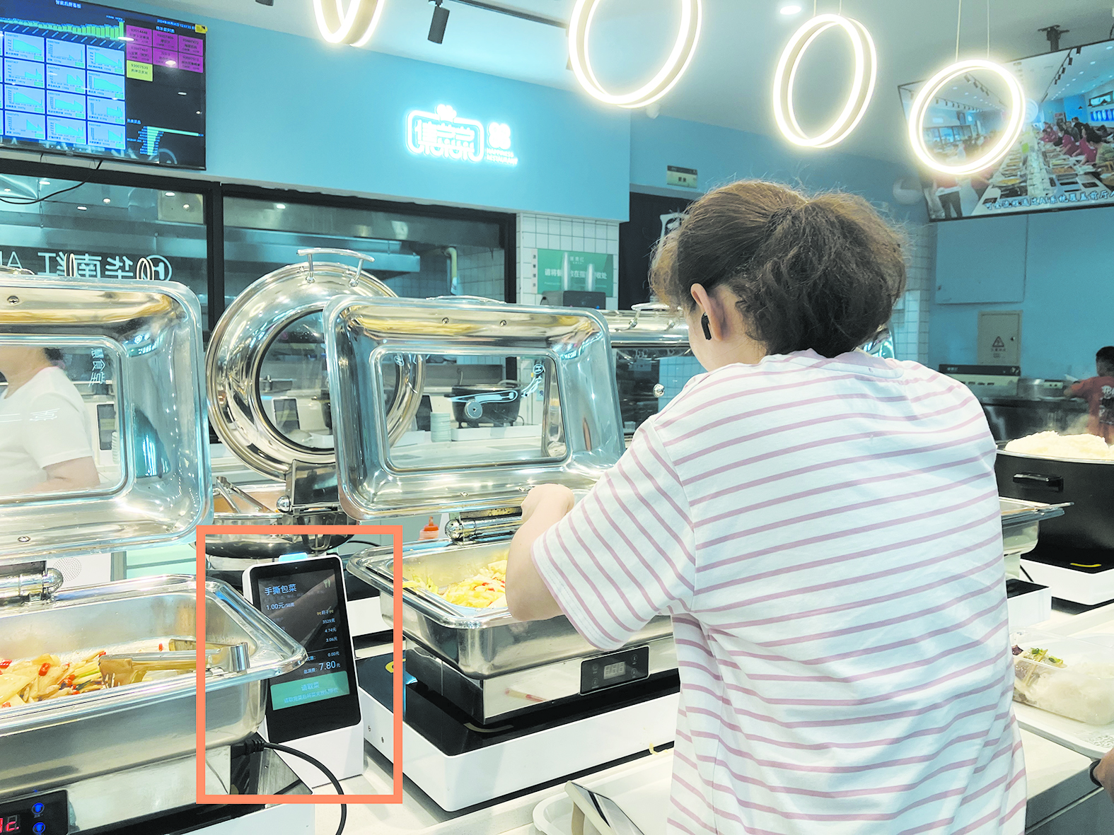 胡先生告诉记者,食客夹菜时,系统会根据原重量减去现有的重量,计算出被取、夹走的菜量,再乘以菜价,就可以算出单个菜品的费用。