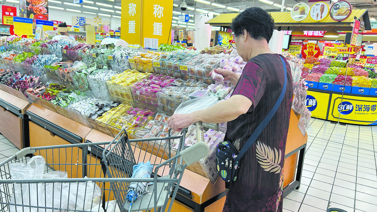 6日下午,记者在沃尔玛购物广场(神农城店)看到,超市显著位置,划出了大面积的月饼销售专区,展台上摆放着各种风味的散装月饼。市民一进店便能感受到浓厚的节日氛围。
