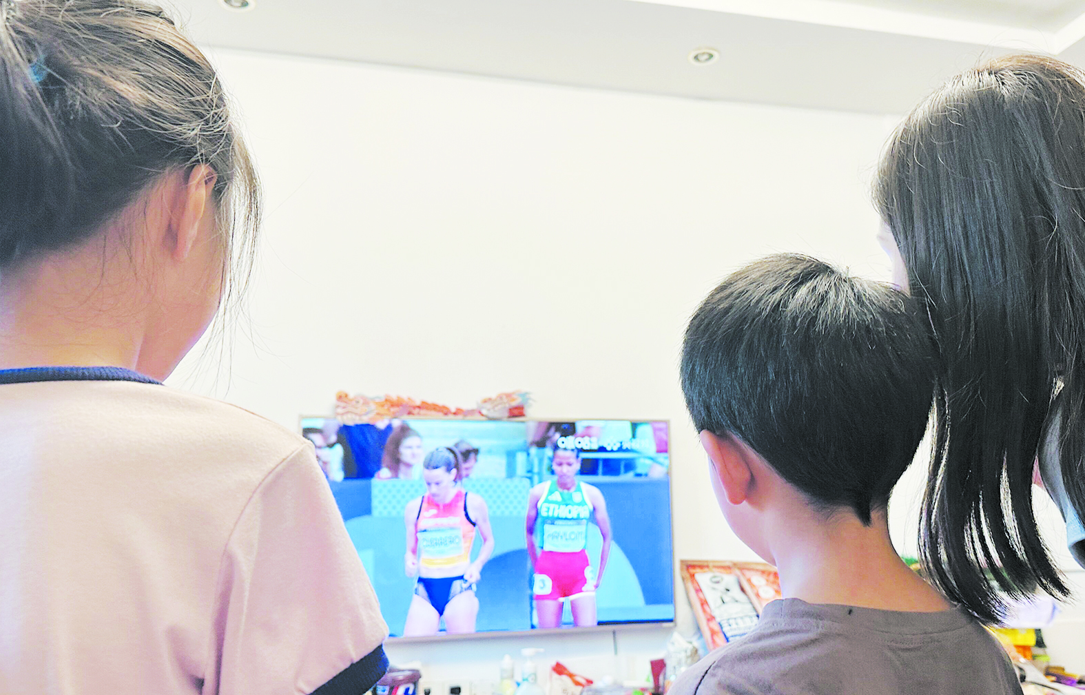 家长带着孩子一同观看奥运会。 记者/戴凛 摄