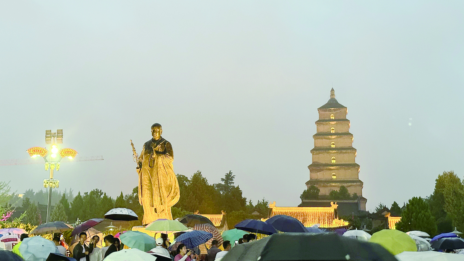 就算是下雨天,西安大雁塔景区也是“人从众”。 记者/戴凛 摄