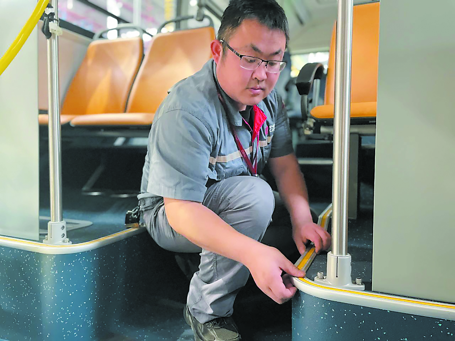 一次,某批量订单正在进行内饰安装,蔡荣华被师傅安排安装前后挡玻璃。安装时他遇到了一个难题:骨架底涂难以清洗到位。爱钻研改善的他想靠自己解决问题,于是仔细查看骨架构造,根据技术特点,自行制作了一个与骨架同样宽的工装——一把宽25mm的刷子,不仅随时可以更换,而且确保了底涂能够一次性清洗到位。