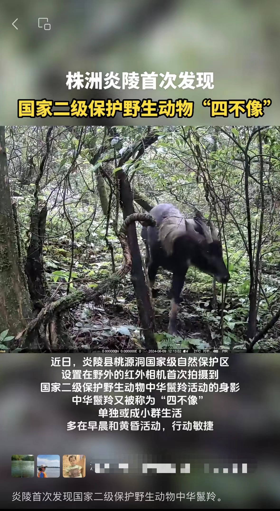 近日,炎陵县桃源洞国家级自然保护区设置在野外的红外相机,又发现新秘密:首次拍摄到国家二级保护野生动物中华鬣羚活动的视频,非常珍贵。中华鬣羚又称“四不像”,单独或成小群生活,多在早晨和黄昏活动,行动敏捷,在乱石间奔跑很迅速。其取食草、嫩枝和树叶,喜食菌类。