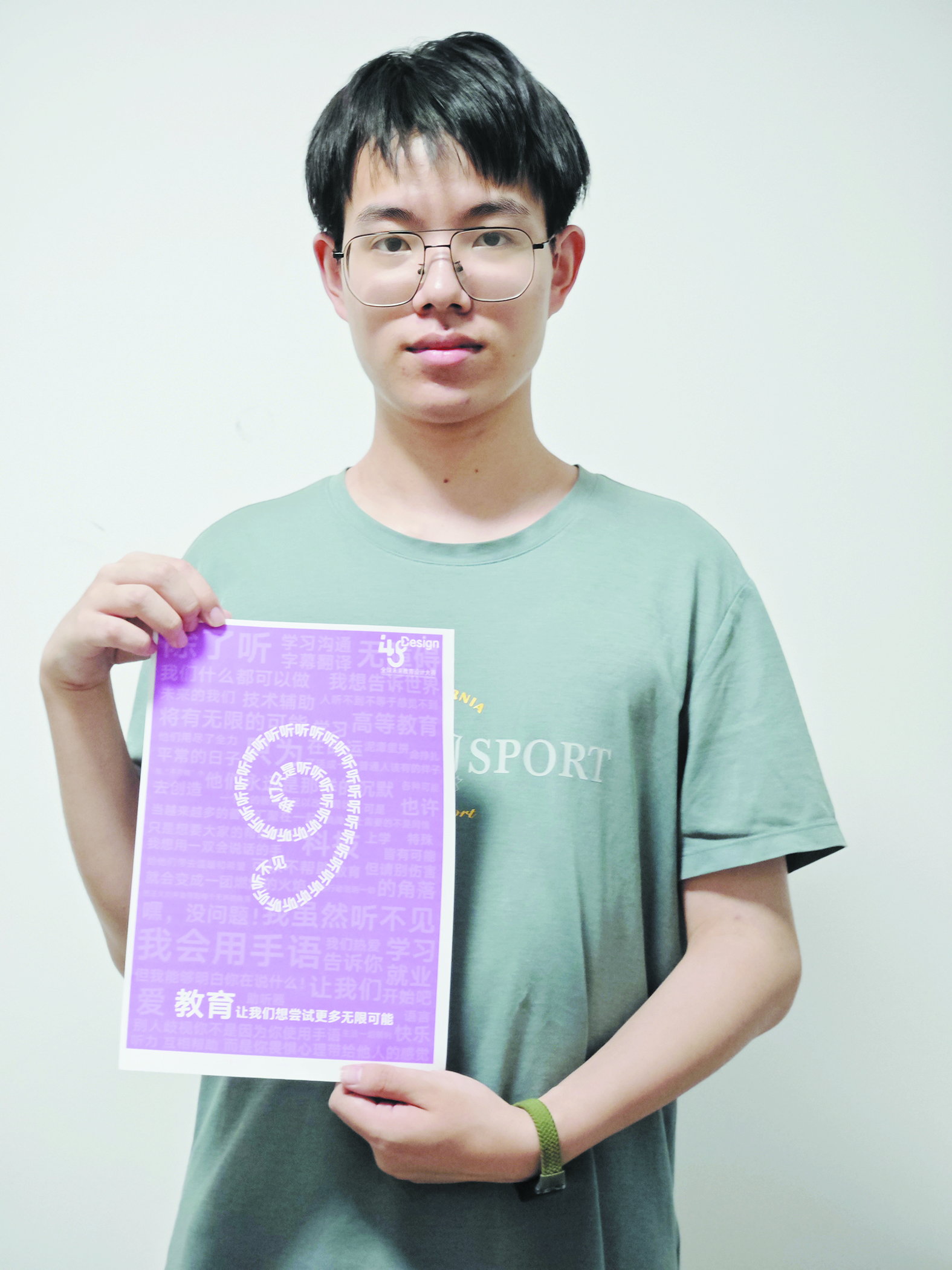 昨日,洪子杰向记者展示了一张他设计的海报。海报的视觉中心是一个由文字构成的耳朵形状,这不仅强调了他聋人的身份,也传达了一个重要的信息,尽管他听不见,但这并不妨碍他接受教育,也不影响追求知识和个人成长。
