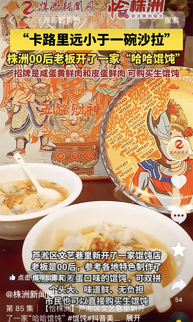 芦淞区文艺巷新开了一家馄饨店,老板是00后,参考各地特色制作了咸蛋黄和皮蛋口味馄饨,可双拼。个头大、味道鲜、无负担,老板:“卡路里小于一碗沙拉”。