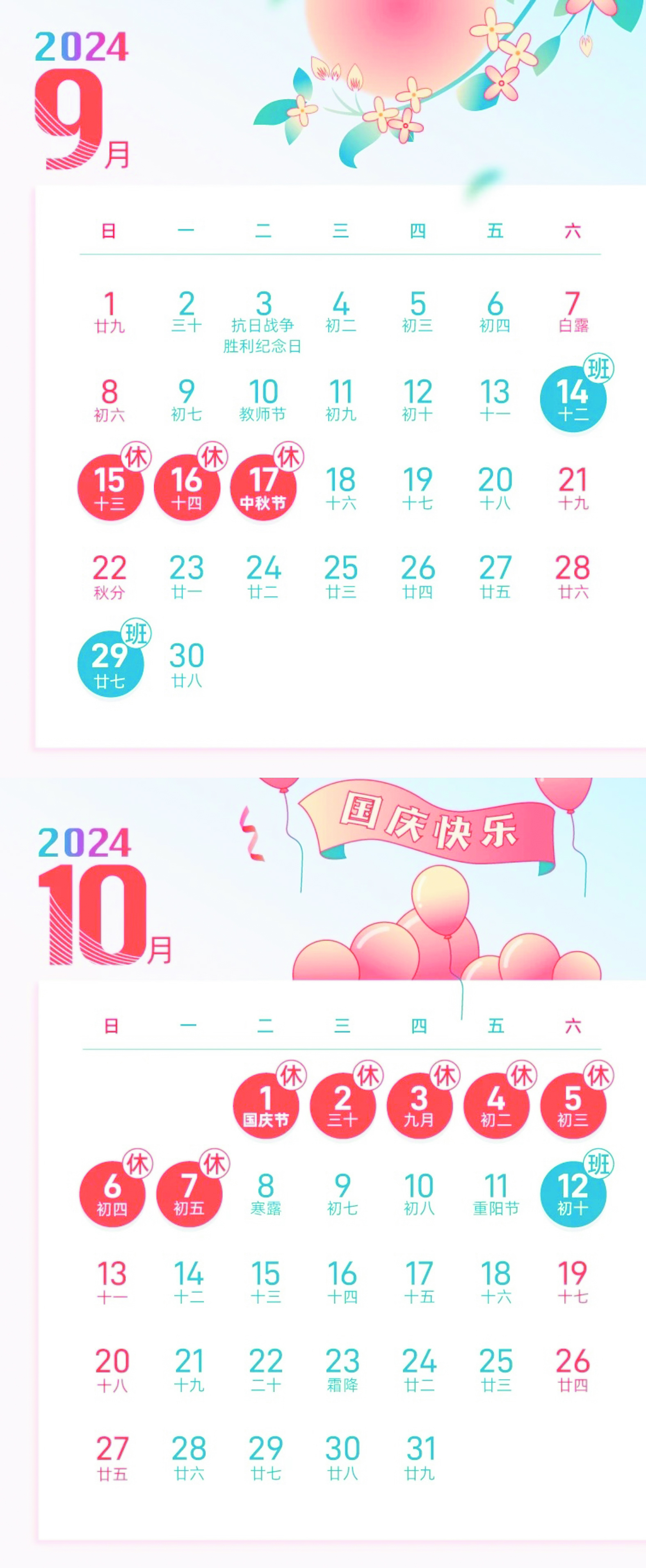 9月、10月调休日历。