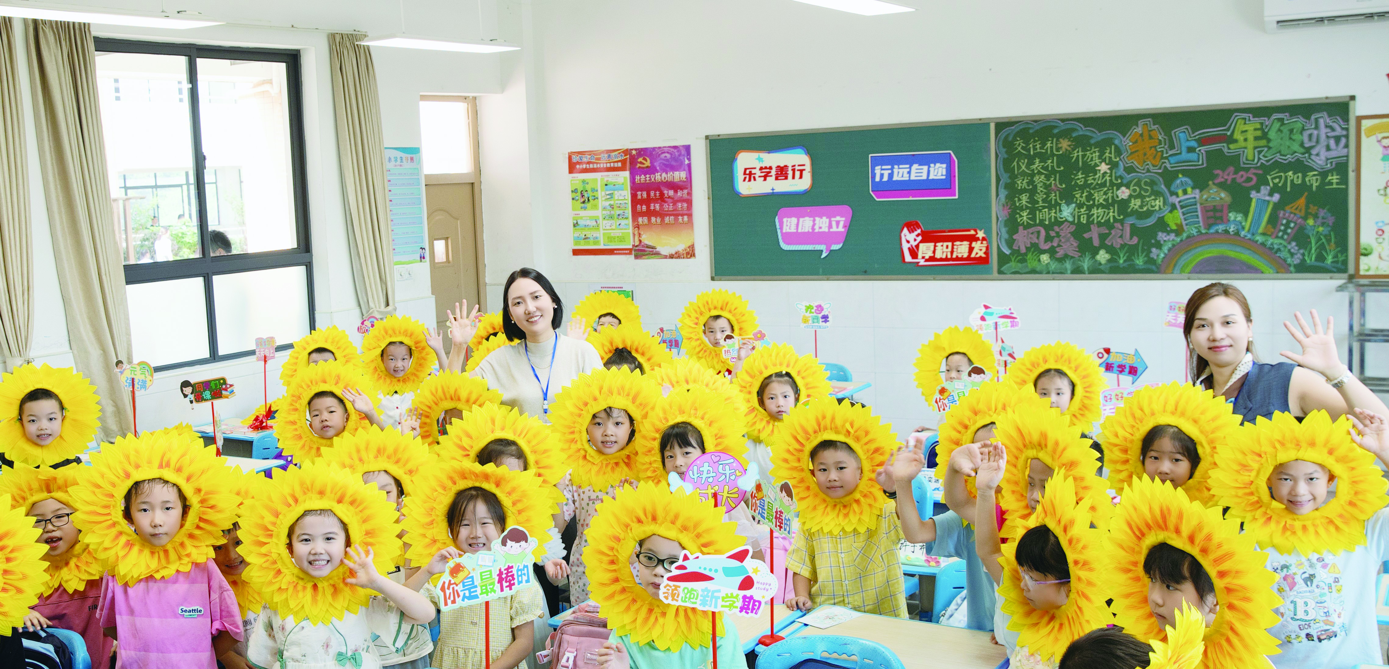 9月1日,我市中小学生陆续回到美好的校园,正式开启新学期。图为市二中枫溪学校小学部西校区迎来一群可爱的一年级新生,他们头戴“花冠”,心花怒放。