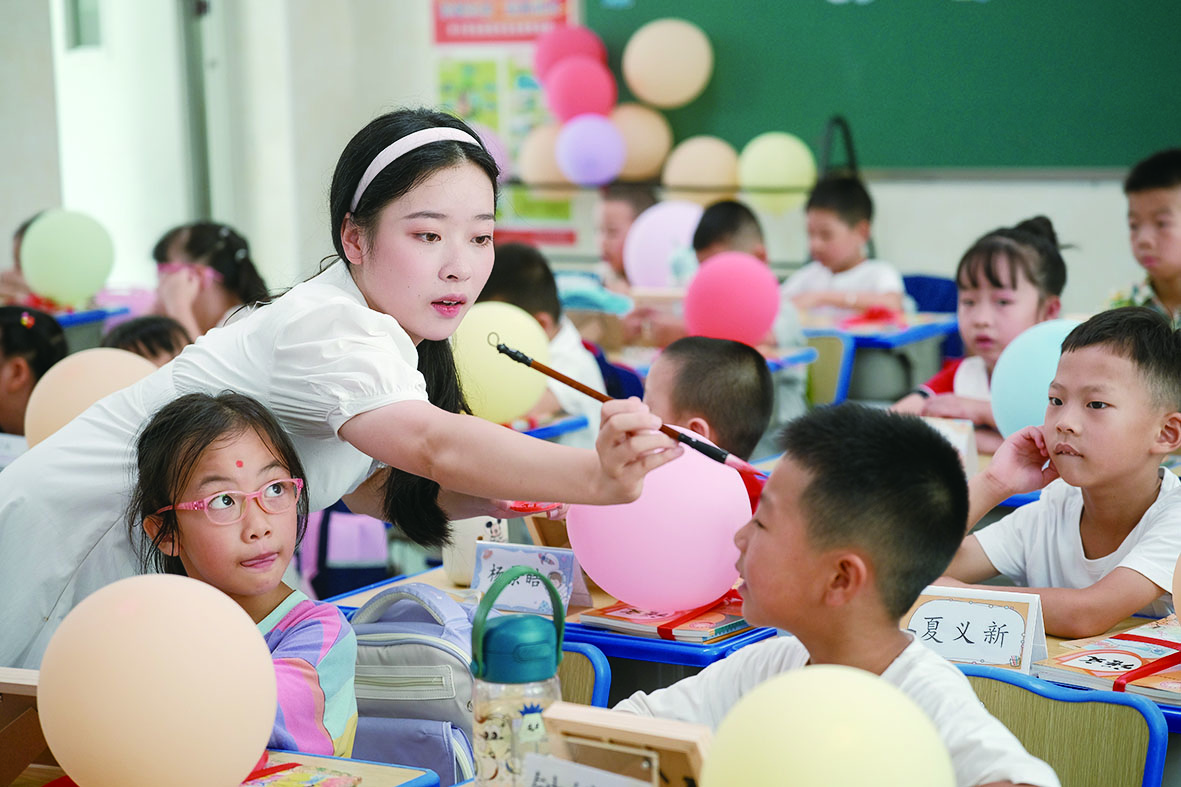 天元区隆兴小学的班主任老师在新同学的额头上点一颗朱砂,寓意眼明心亮,开启智慧之门。 株洲晚报融媒体记者/孙晓静 通讯员/王鹤书 摄
