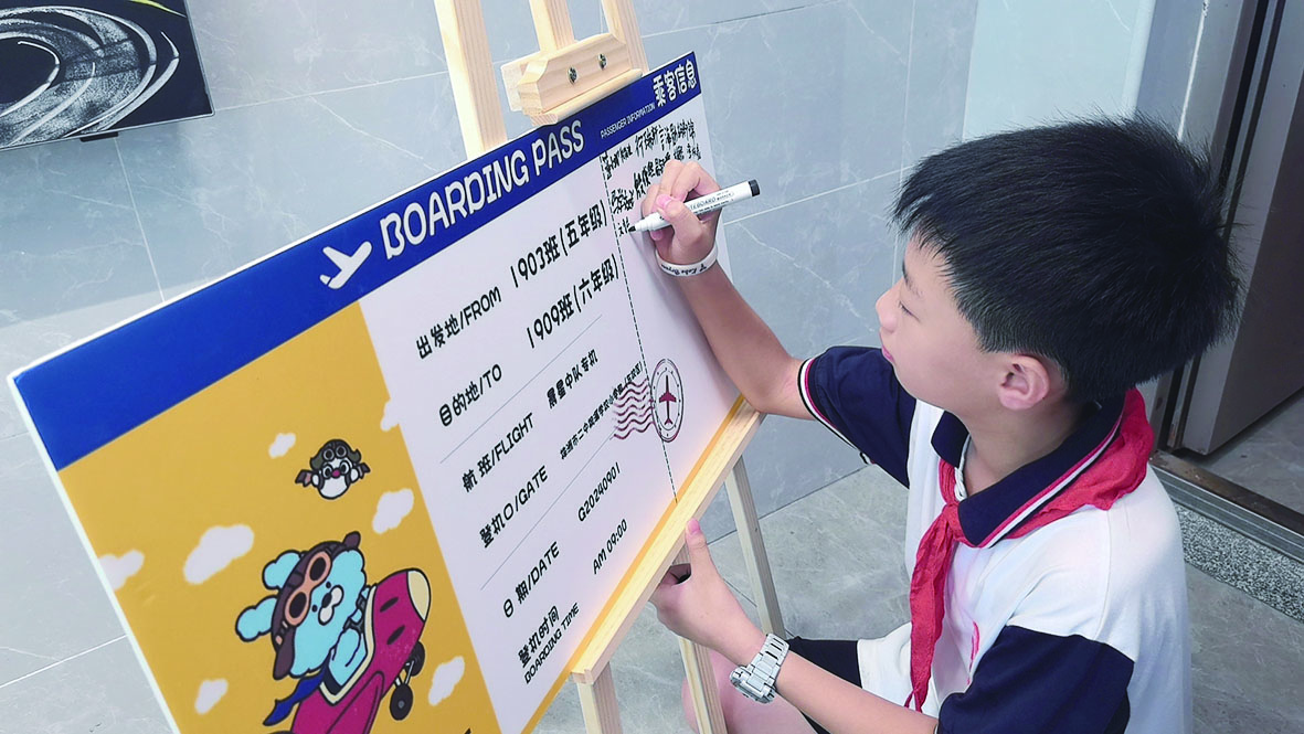 市二中枫溪学校小学部东校区的同学们,在“机票”上打卡签到。以独特的报到方式,迎接新学期的到来。 记者/戴凛 通讯员/程玲 摄