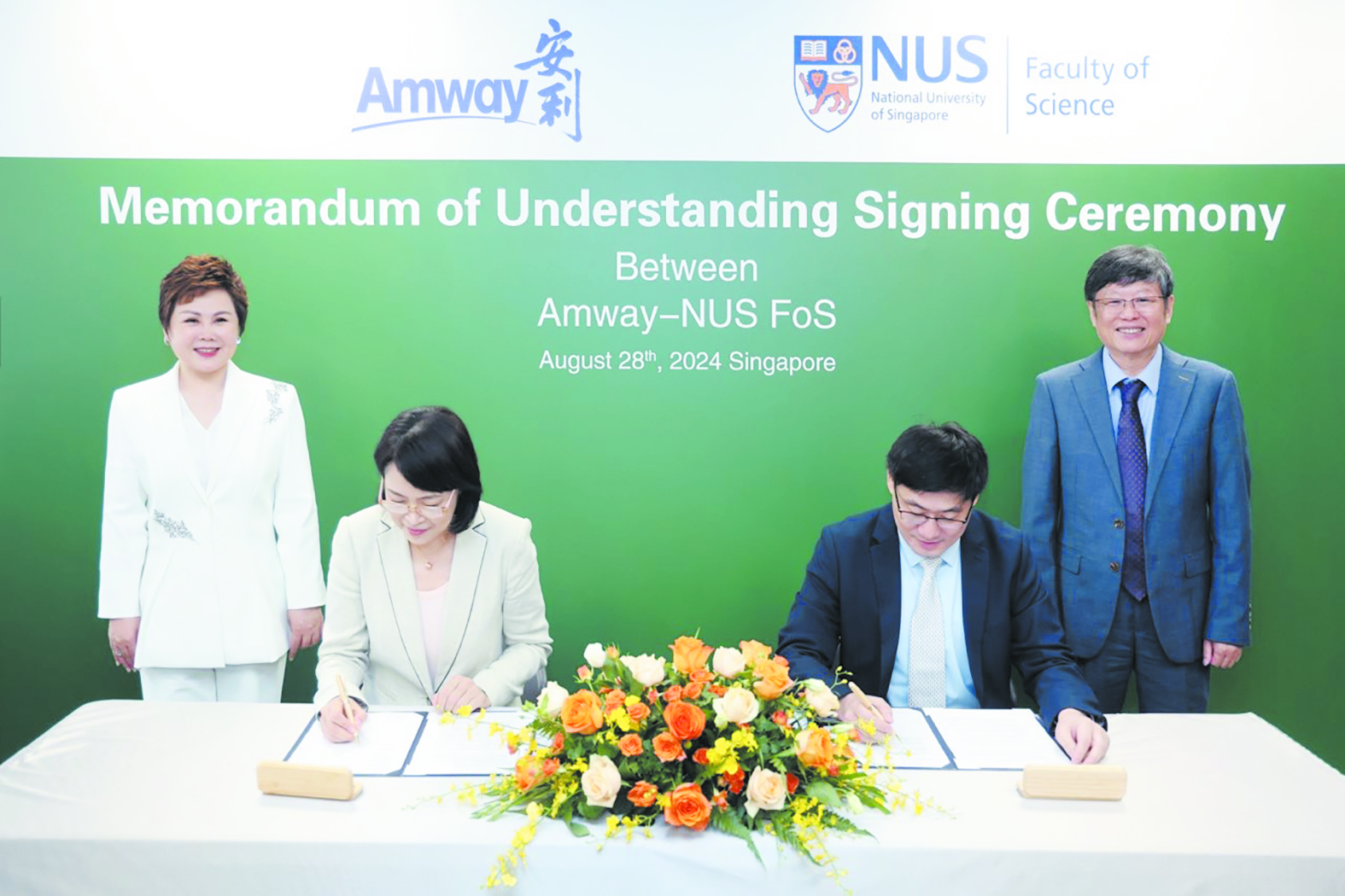 8月28日,安利公司与新加坡国立大学签署合作备忘录,并共同宣布,将在植物蛋白与植物营养素等研究领域开展更为深入的合作。安利(中国)市场部副总裁及安利亚洲科技创新中心副总裁陈佳女士与新加坡国立大学理学院副院长陈伟教授,代表双方签署协议。