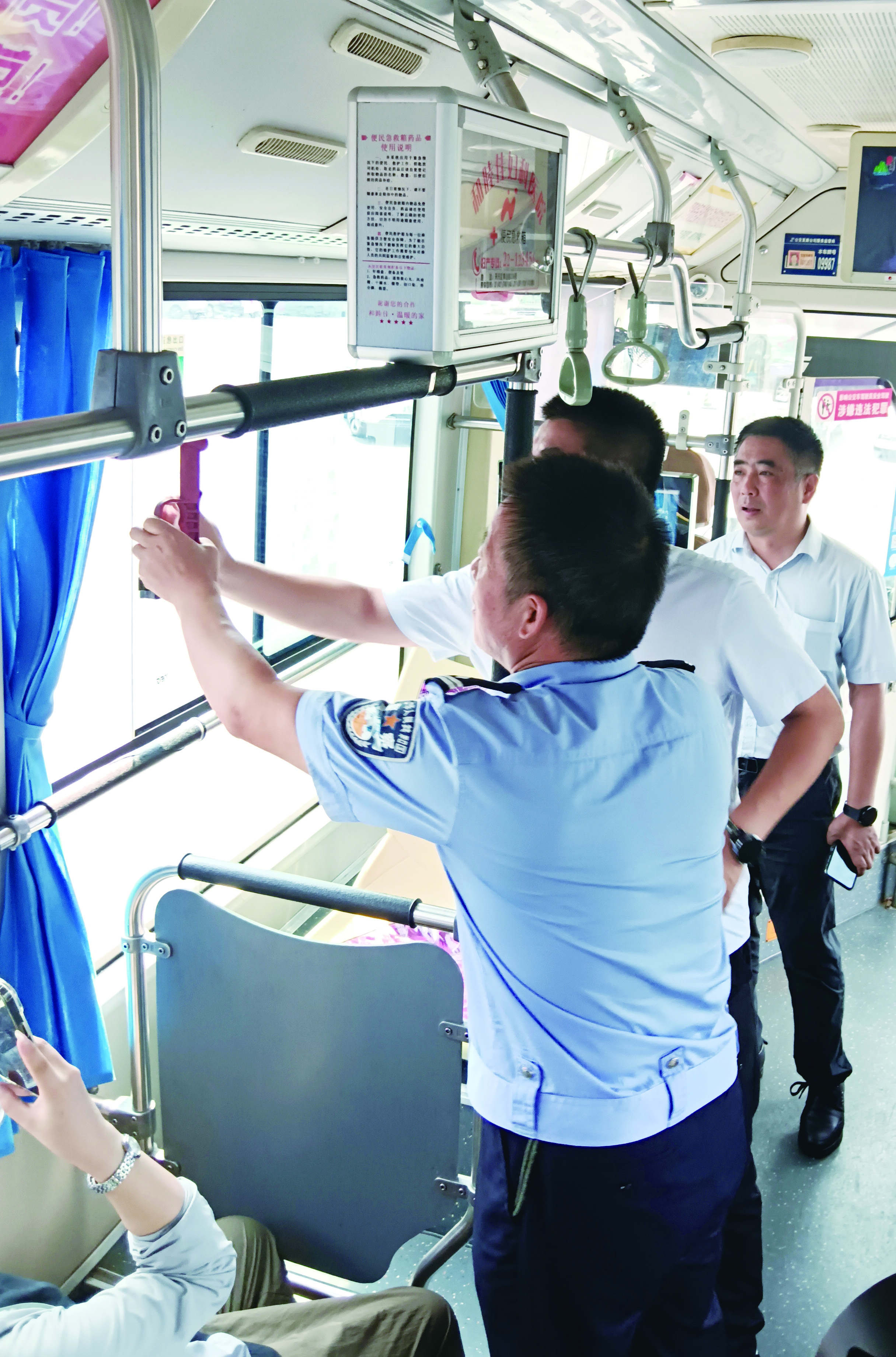 督察人员检查定制公交车的安全设施。 记者/沈全华 摄