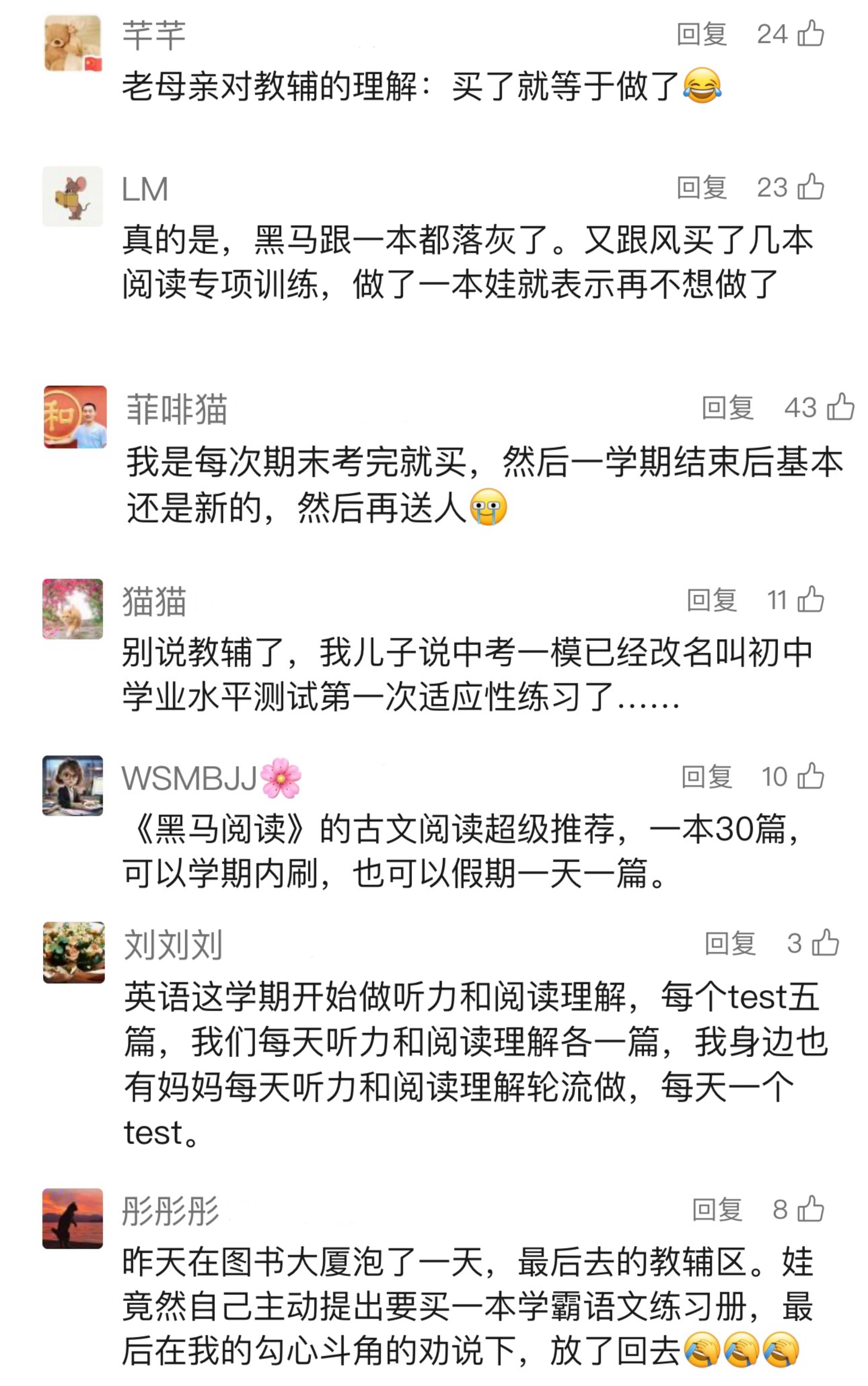 “上个学期购买的教辅书,好多都没做。买这些书,似乎是为了安心。”一位家长坦言,知道孩子可能做不完,但总觉得有了这些书,心里就踏实一些。
