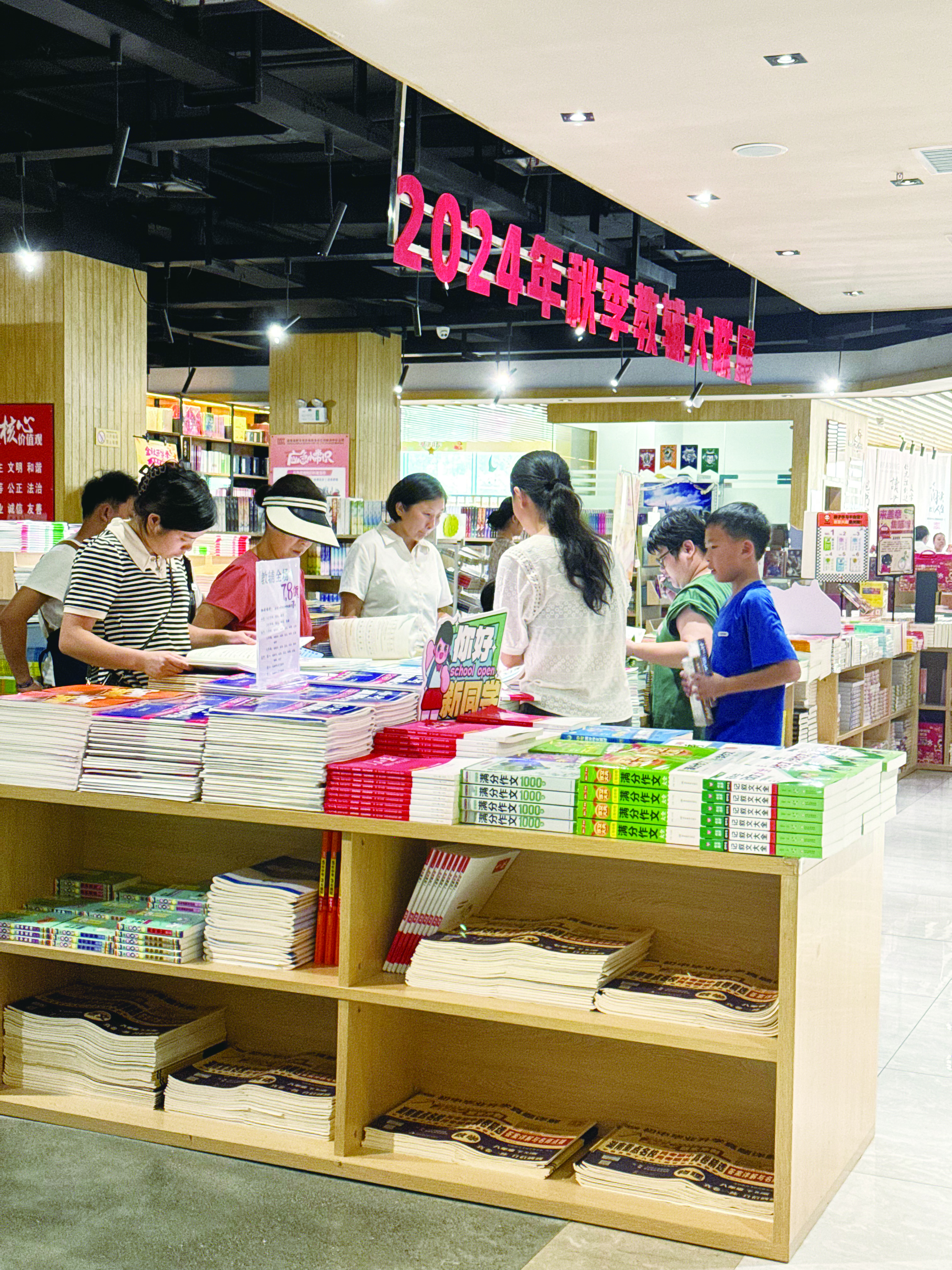 9月3日下午5时许,新华书店神农城店“2024年秋季教辅大联展”专区,不少家长、孩子在选购教辅。他们有的专注地低头翻阅着手中的书籍,仔细比较每本书的内容和特点;有的则轻声讨论,彼此交流着对不同教辅书的看法和建议。