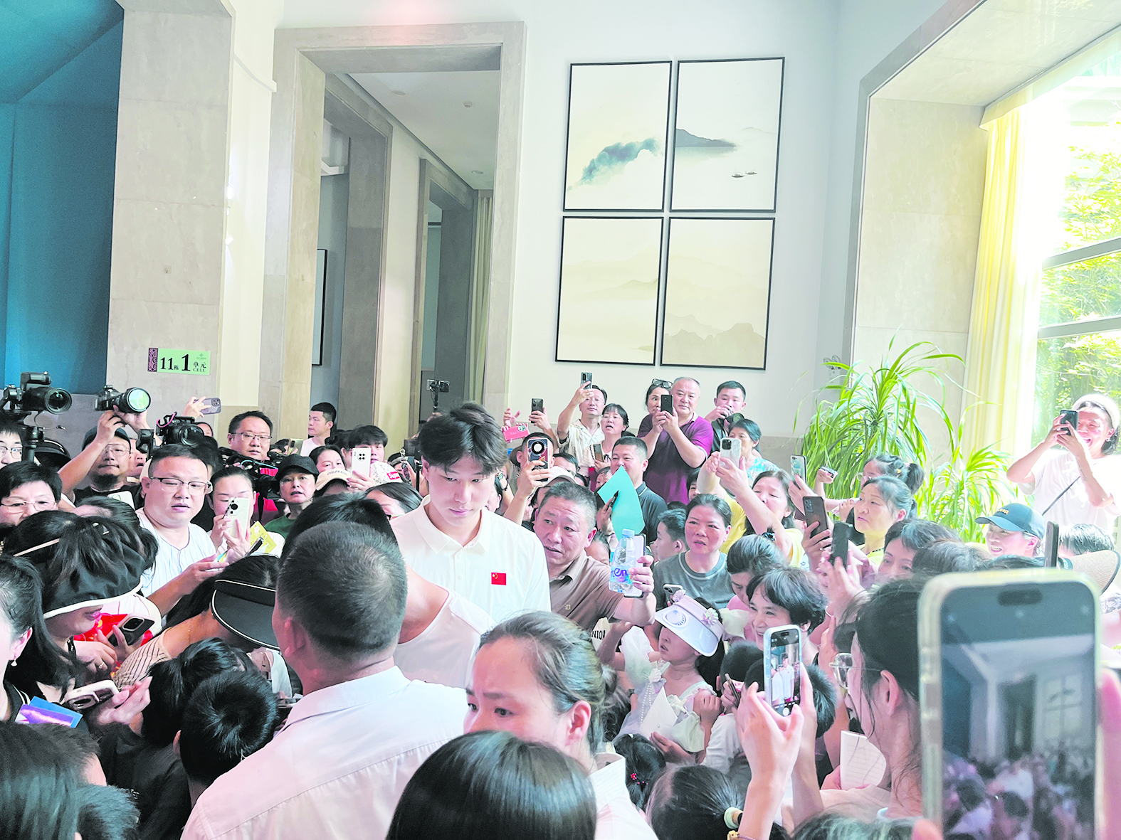 9月8日上午,巴黎奥运会冠军覃海洋乘坐的航班抵达黄花机场,忙于备战赛事的他,已经两年没有回家。当天,覃海洋随父母一起回到家乡株洲,受到家乡父老的热情迎接。