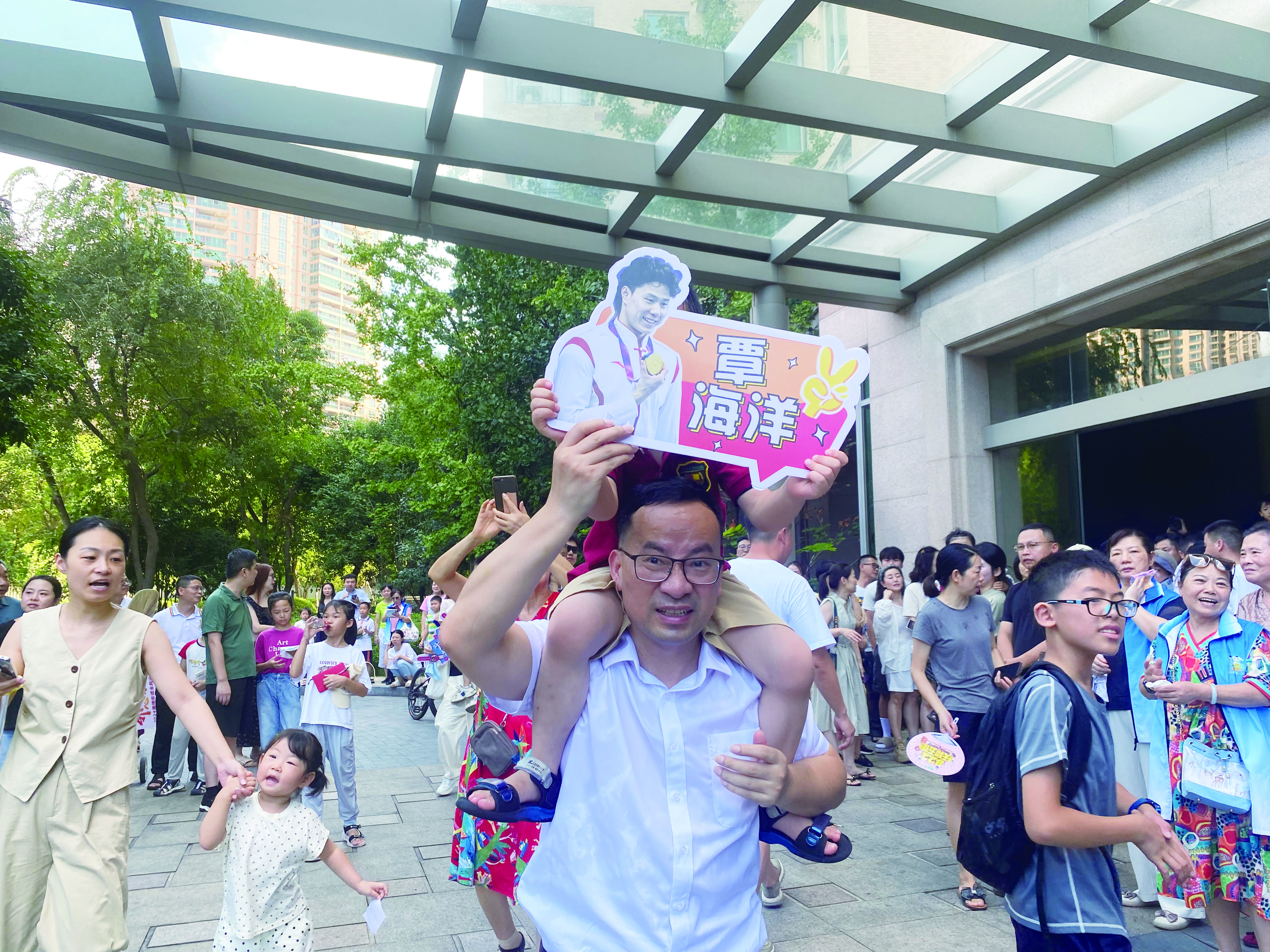 9月8日,小朋友骑在爸爸肩膀上看心中偶像奥运冠军覃海洋。株洲晚报融媒体记者/旷昆红 摄
