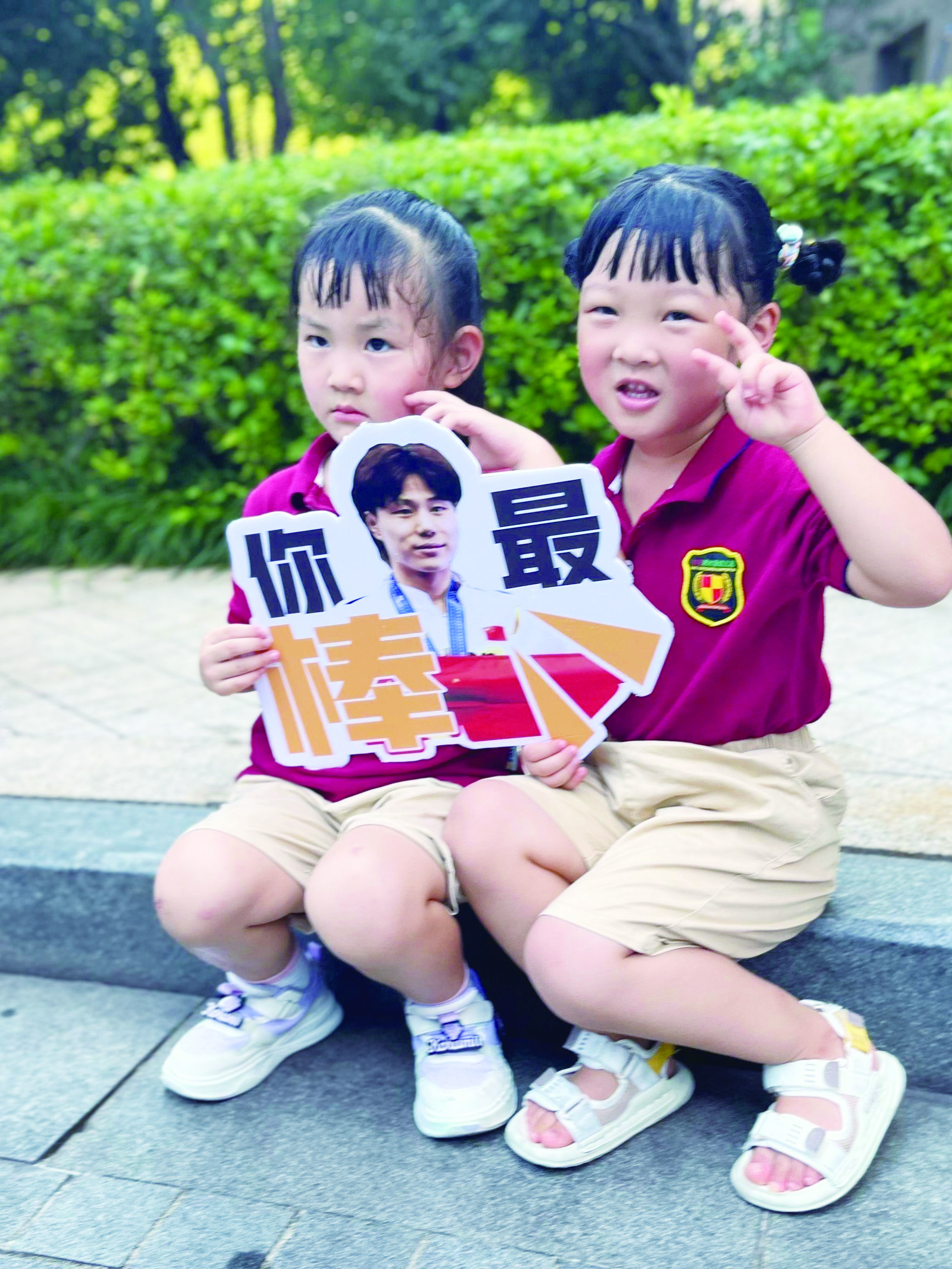 9月8日,幼儿园小朋友举着应援牌等待奥运冠军覃海洋。 株洲晚报融媒体记者/旷昆红 摄
