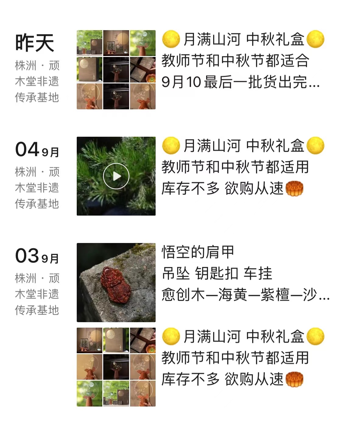 吴穷时朋友圈内,他与一家礼品商家推出的中秋系列木艺摆台与月饼的组合礼盒获得诸多“点赞”。受访者供图