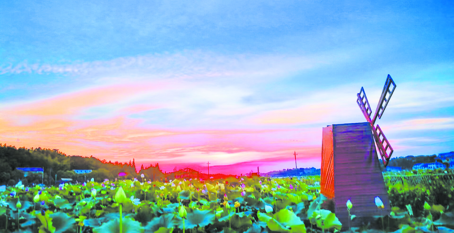 荷塘区仙庾岭,晚霞与荷花相映成趣。通讯员/王小晋 摄