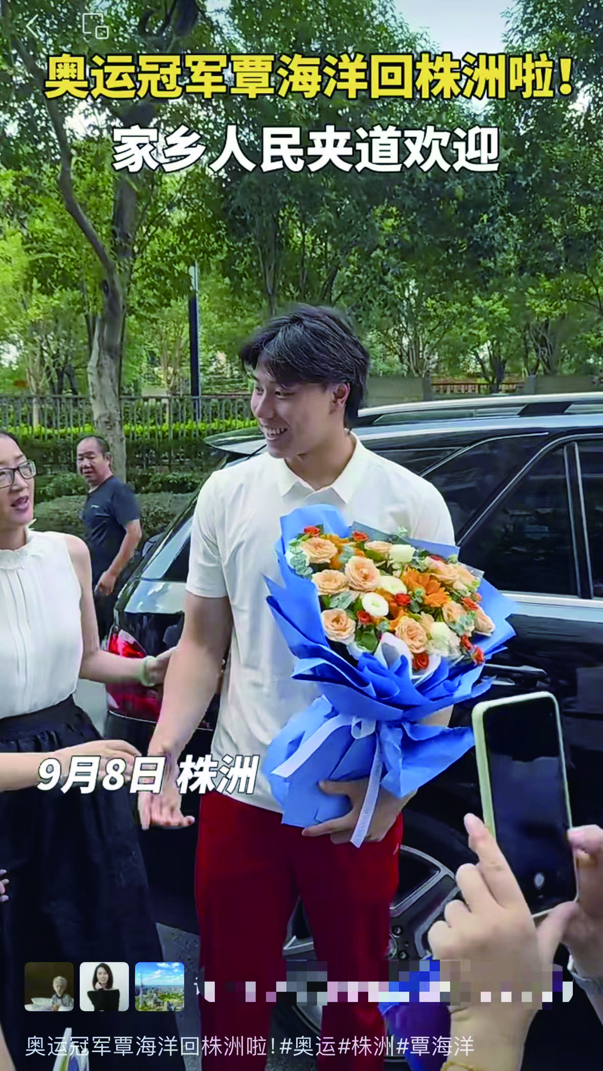 9月8日上午,巴黎奥运会冠军覃海洋乘坐的航班抵达黄花机场,忙于备战赛事的他,已经两年没有回家。当天,覃海洋随父母一起回到家乡株洲,受到家乡父老的热情迎接。