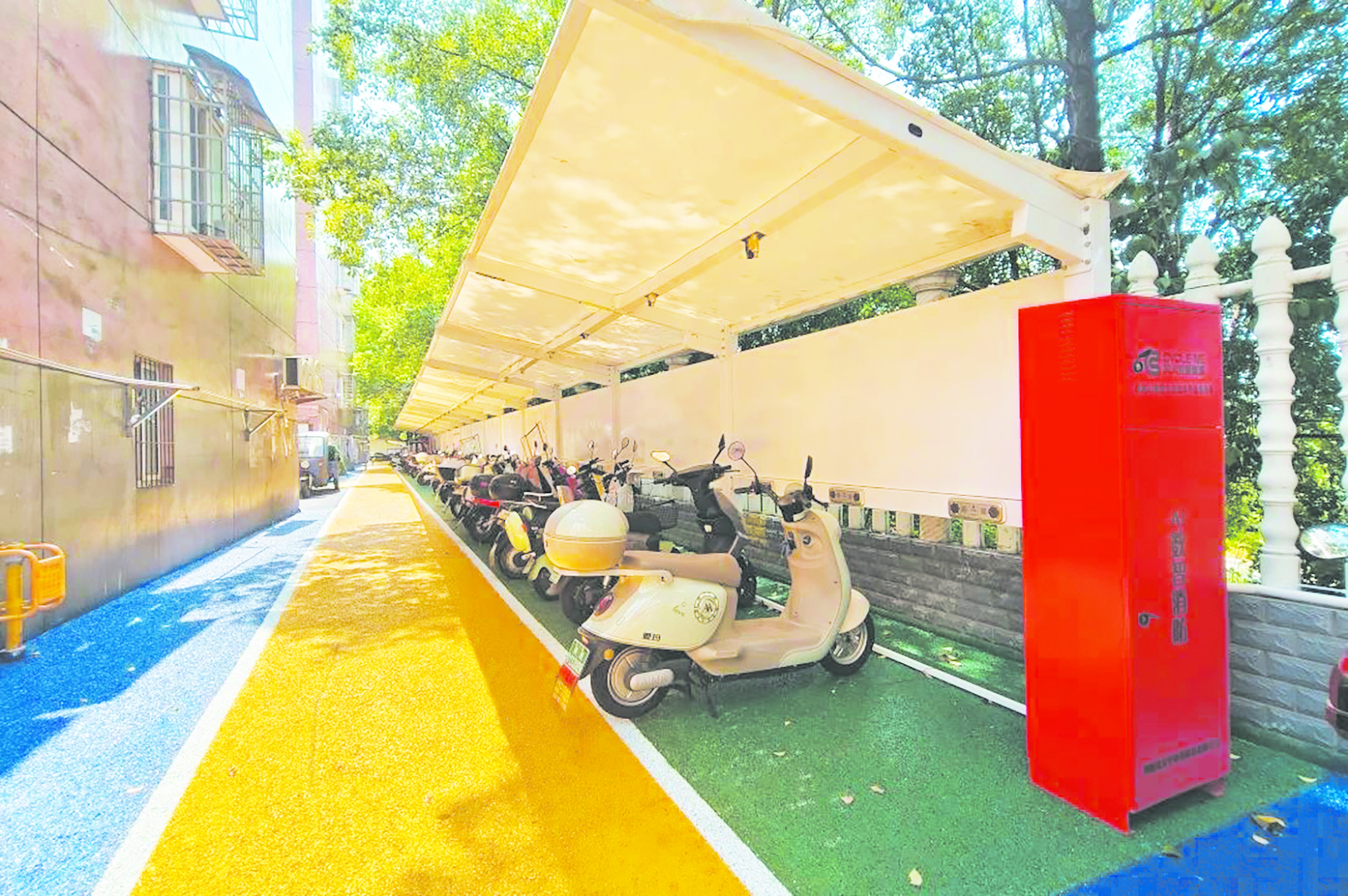 晨光小区装了4个充电棚,共计160余个充电接口。电动摩托车每台每次的充电费用为1元-2元。充电桩设有充满自停、过载保护等安全保护措施,电动摩托车统一充电处设有雨棚、喷淋设施和监控摄像头。