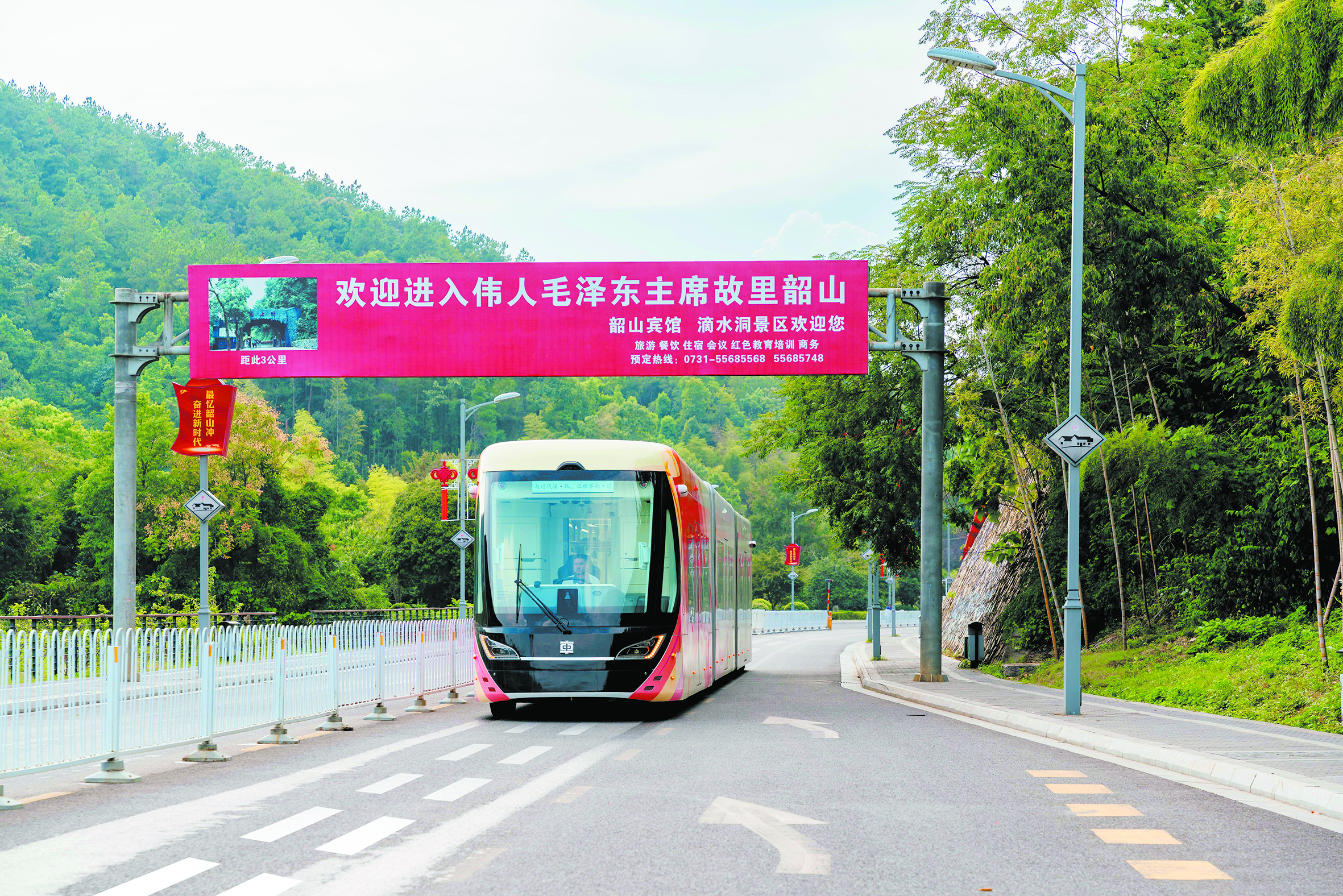 本报讯(株洲晚报融媒体记者/高晓燕 通讯员/姜杨敏) 9月10日下午,“东方红”号智轨行驶在红色旅游胜地韶山景区的道路上,正式开启试跑之旅,为韶山景区增添了一道靓丽的旅游风景线,也将为游客带来独特的乘坐体验。