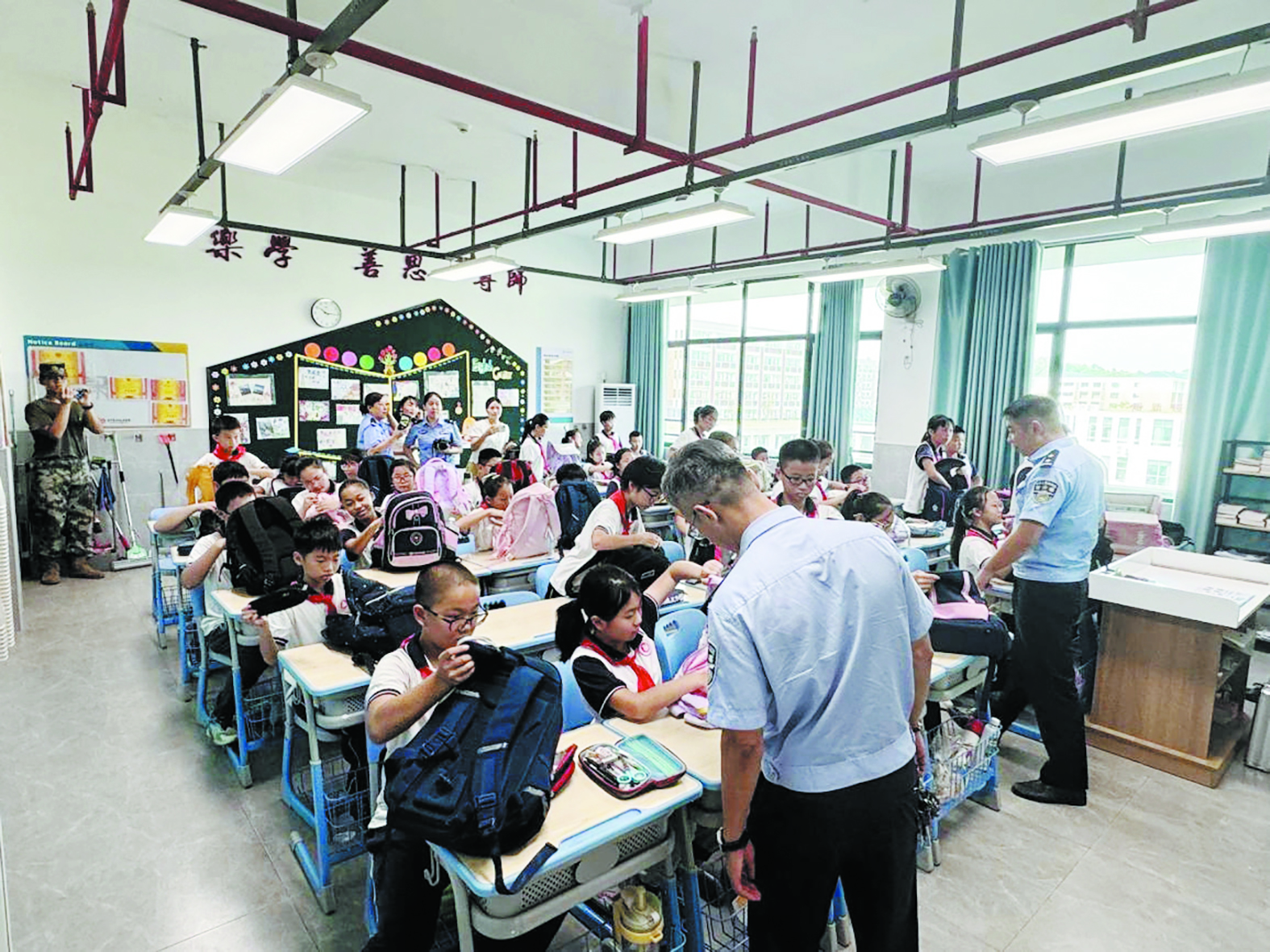日前,株洲市二中枫溪学校小学部东校区邀请法治副校长和派出所民警,进校园开展开学法治安全教育,并入班开展了管制刀具等危险物品的排查工作。为了满足同学们的好奇心,民警还向同学们展示了警用“八大件”。通过有趣的互动活动,加深了学生对安全防护的意识。