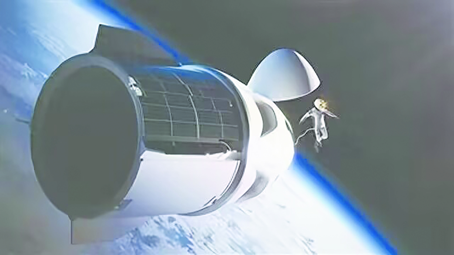 “北极星黎明”号艺术图显示,一名机组人员通过生命维持带漂浮在“龙”飞船太空舱外。 图片来源SpaceX