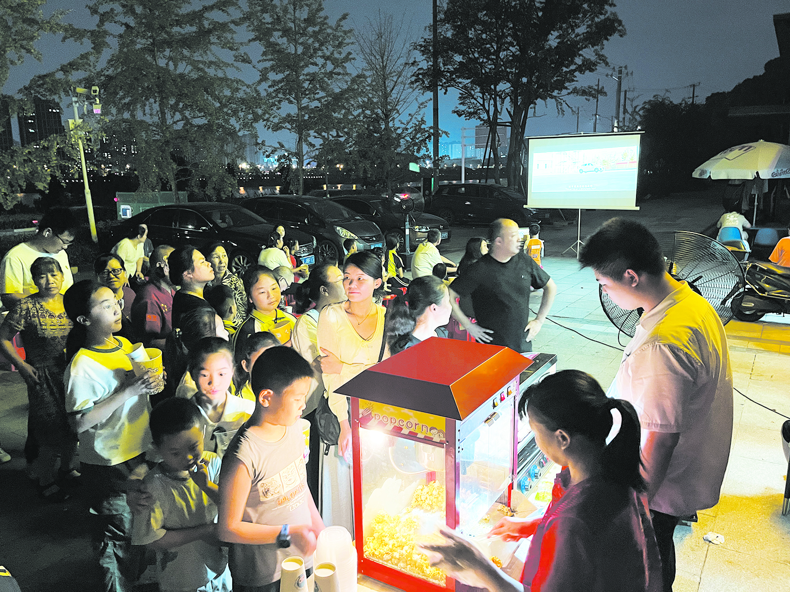 【露天电影】 9月14日晚,石峰区白石港社区联合碧桂园江山一品小区物业人员开展“啤酒挑战”和露天电影活动,居民欢聚一堂迎中秋。 记者/刘平 摄