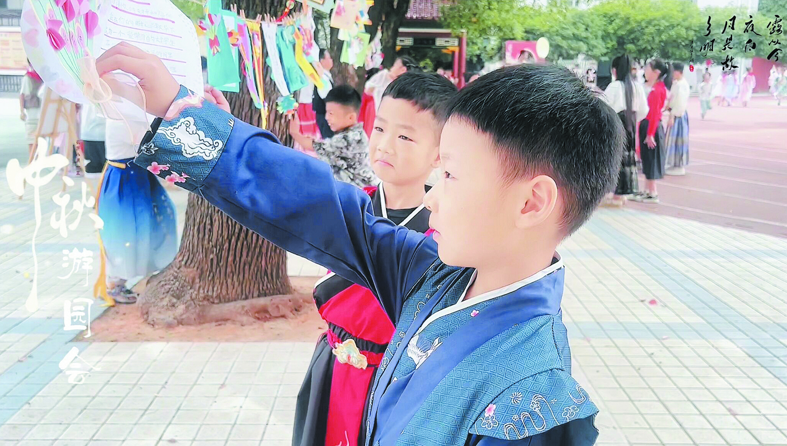 【汉服秀】 9月14日,芦淞区何家坳小学举办“我们的节日——中秋节”主题活动。现场有汉服秀、中秋寻“秋”、猜谜、读诗、赏灯等活动,大力弘扬中华优秀传统文化。 记者/戴凛 通讯员/黄薇 摄