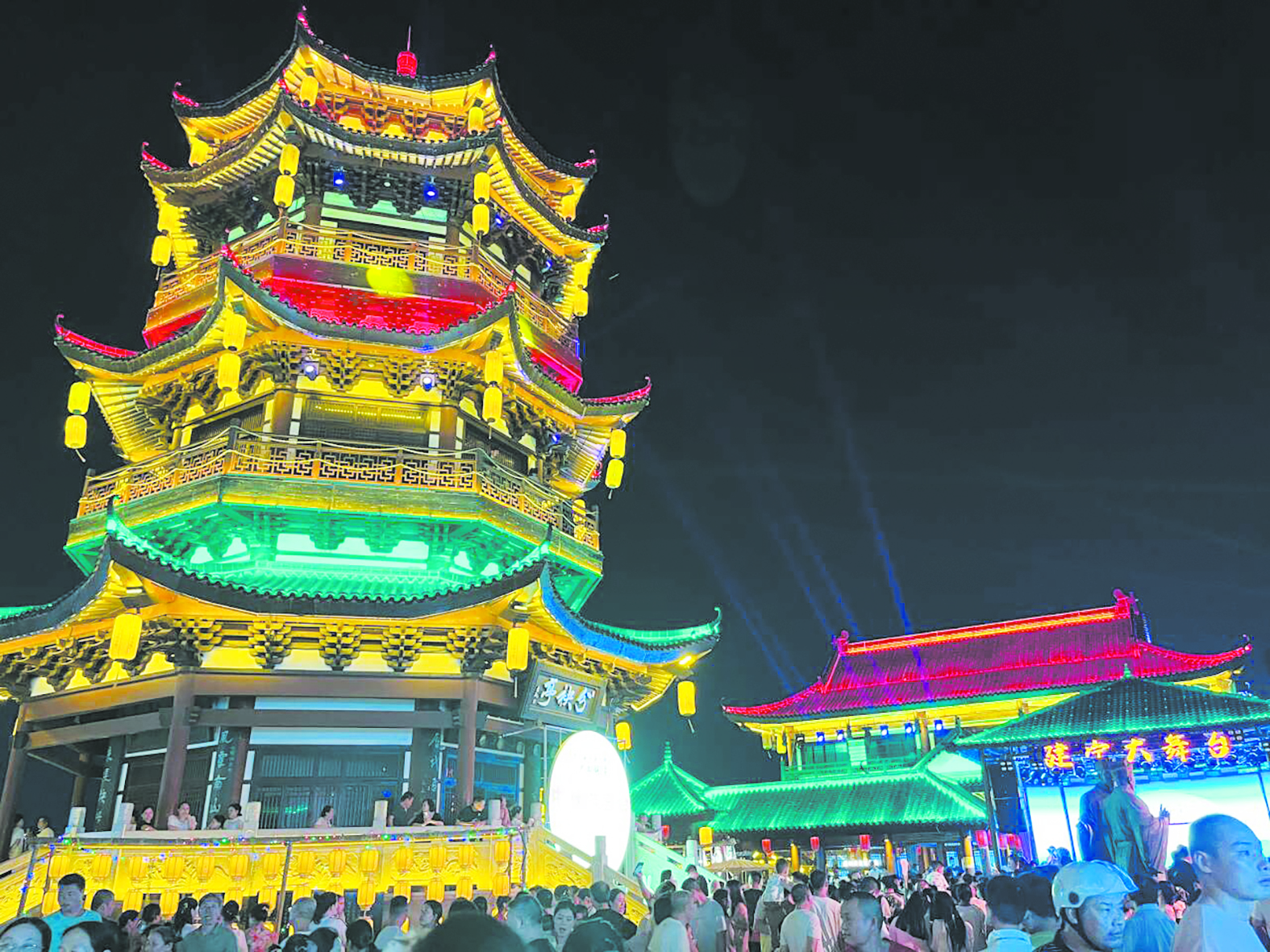 随着夜幕降临,分袂亭被一盏盏灯笼点缀得如梦如幻,璀璨的光芒照亮夜空,为这场游园会增添了几分神秘与浪漫。《建宁千古情》实景表演震撼上演,生动演绎株洲历史渊源,吸引了无数游客驻足观看,欢呼声此起彼伏。
