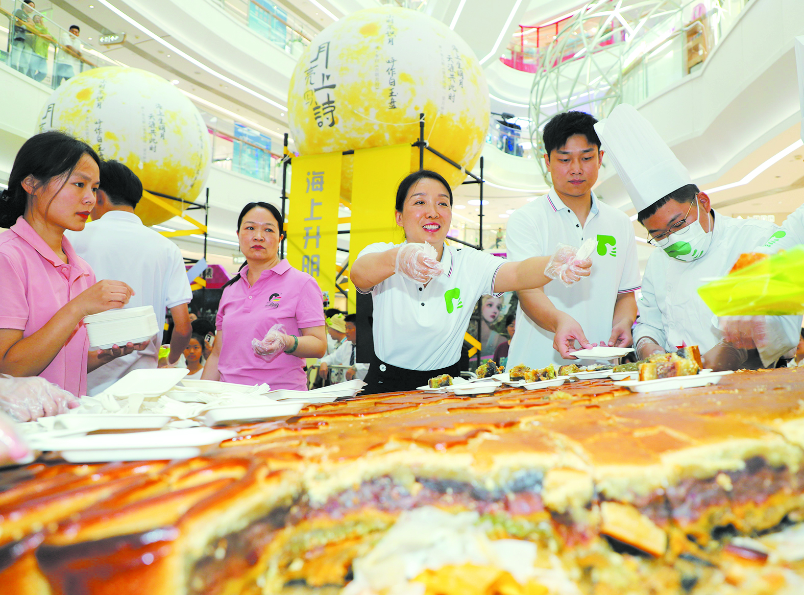 9月17日,在河南省南阳市吾悦广场,工作人员在切割“超级大月饼”分给游客。图据新华社