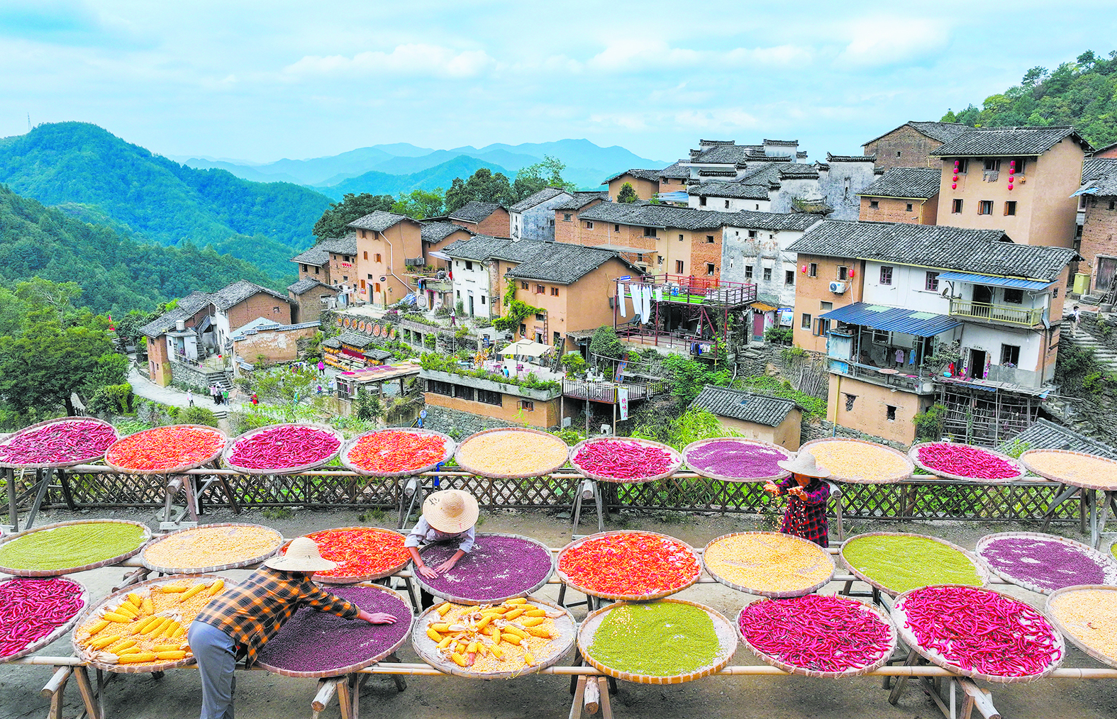 9月22日,在安徽省黄山市歙县阳产村,村民在土楼前晾晒农作物(无人机照片)。 秋分时节,我国迎来第七个“中国农民丰收节”。各地农民在田间收获农作物,到处是喜人的“丰”景。