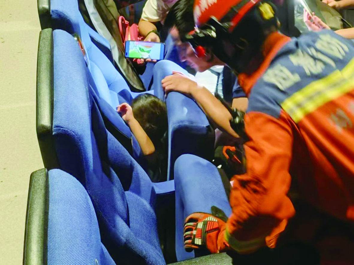 不少家长周末会带孩子去电影院看电影,但要注意的是,电影院里的座椅可能存在安全隐患。近日,攸县消防救援大队接到报警称,该县一影院放映厅内有人被困。消防员赶往现场救援。