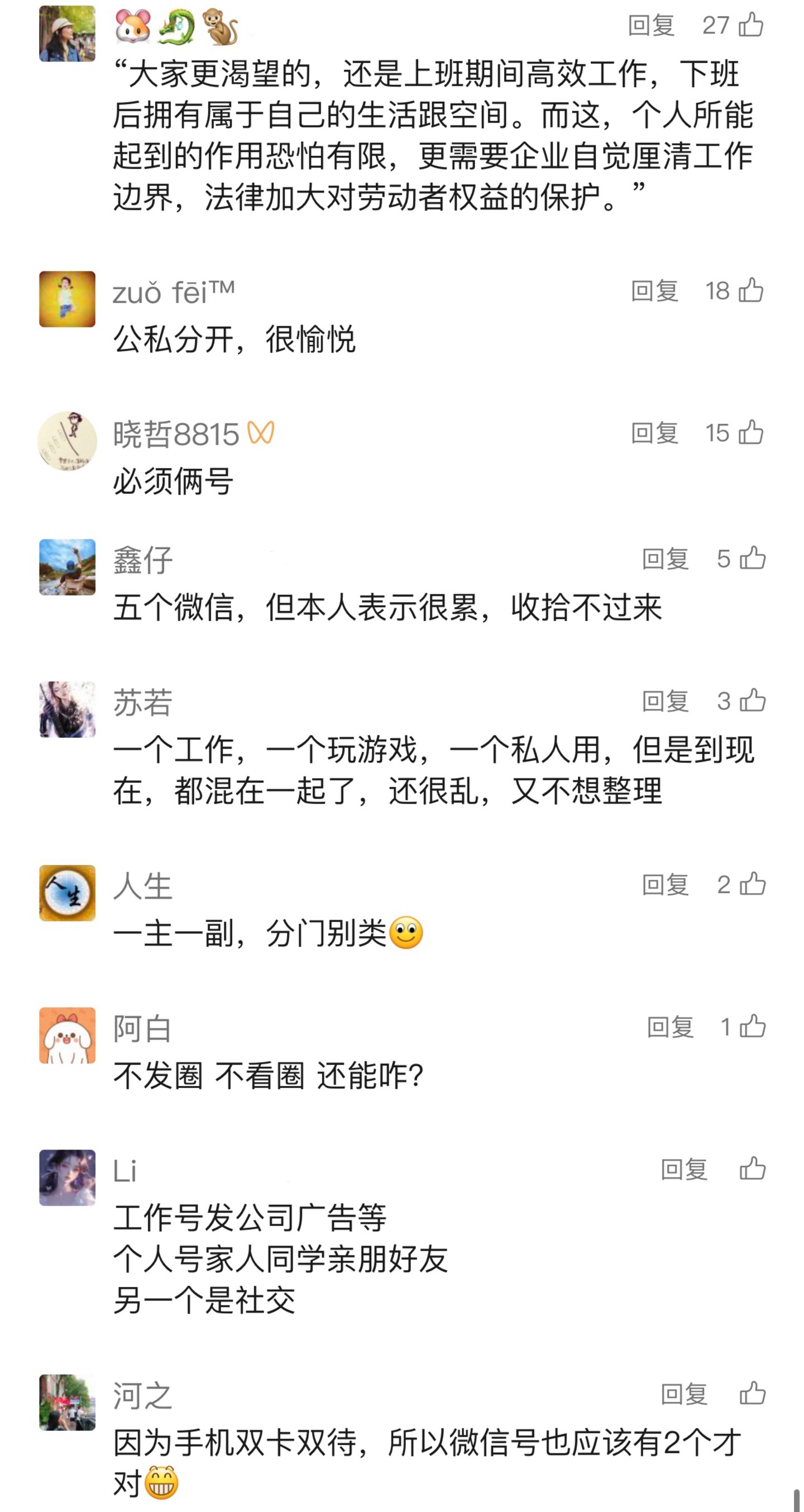 “我们公司经常要求我们在朋友圈发一些卖房广告,那段时间我的私人号几乎被工作内容淹没了。”从事物业工作的刘女士无奈地说,“连我女儿都问我,是不是换工作去卖房了?”为了找回生活的宁静,上个月,刘女士建了一个工作号,将所有与工作相关的内容都迁移过去。