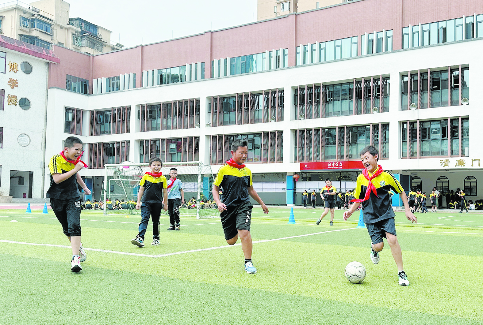 学生利用课间时间踢足球。 记者/戴凛 摄