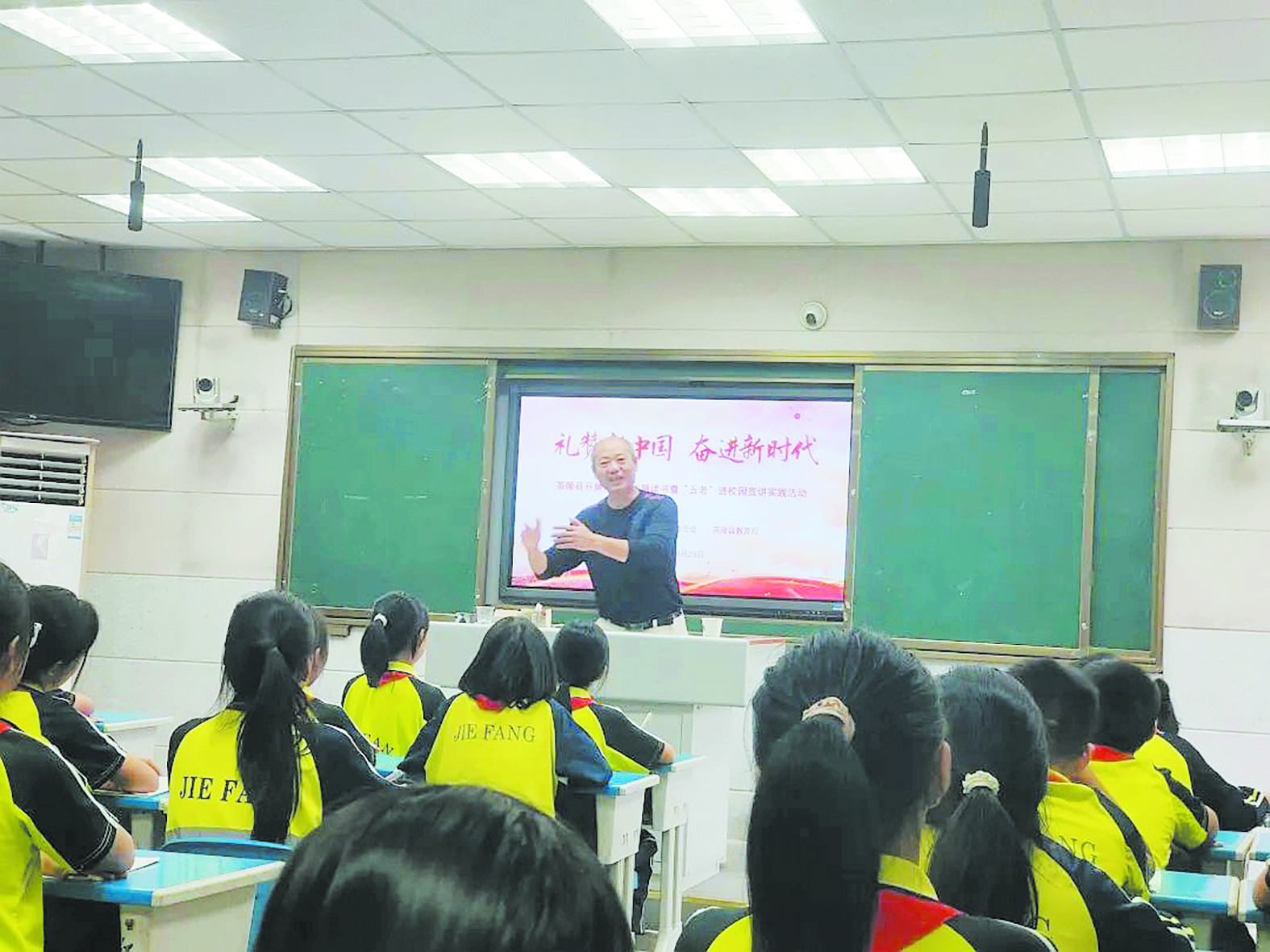 9月23日,茶陵县教育局党史主题教育宣讲团“五老”成员戴宁凯来到茶陵县解放学校,为学生们带来一场精彩的“礼赞新中国,奋进新时代”红色主题宣讲活动。